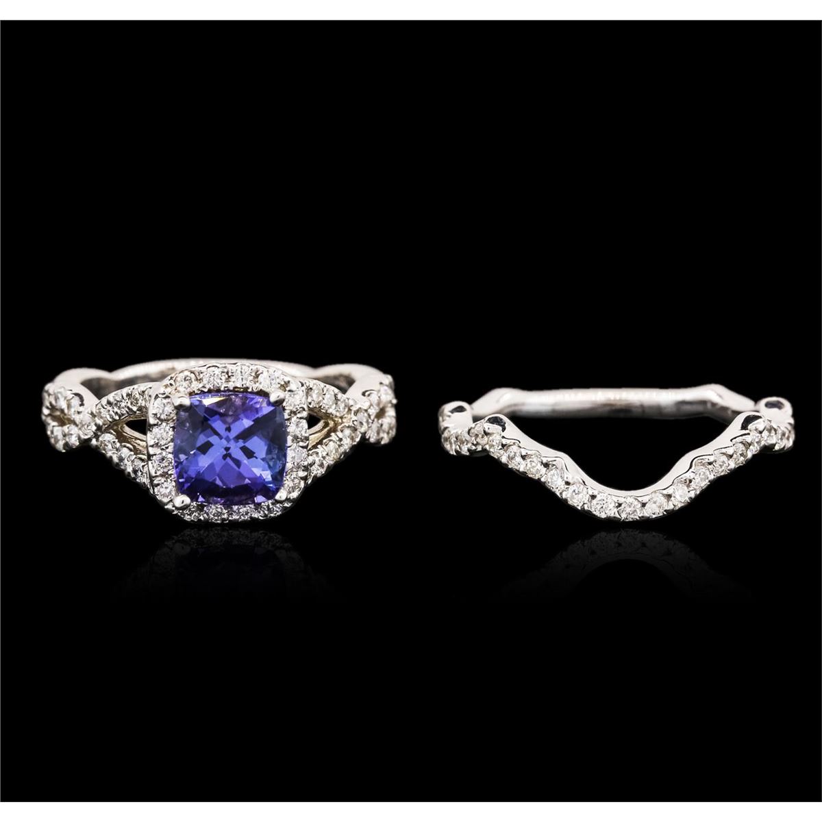 One electronically tested 14KT white gold ladies cast tanzanite and diamond ring and guard with a bright polish finish. Identified with markings of "14K". Condition is new. Containing: One prong set square cushion modified brilliant cut natural tanzanite, measuring 6.20 x 6.20 x 4.03mm, approximate weight of 1.22ct., clarity is eye clean, type I, medium light, very slightly grayish, violet color, (GIA V 4/3), cut is good. Seventy-Seven prong set round brilliant cut diamonds, measuring 1.30 - 1.30 x 0.78mm (depth est.) approximate total weight of 77 Stones = 0.62ct. Clarity: I-1 to I-2. Color: I - J, Cut is Good. Colored gemstones are presumed to have been subjected to commonly used enhancement processes. All diamonds and colored gemstones are graded in the mounting, unless otherwise stated. Total Weight of Colored Stones 1.22ct. Total Weight of Diamonds 0.62ct. Total Weight of Ring And Guard 7.40 grams. GGL Appraised at $4,775.00.