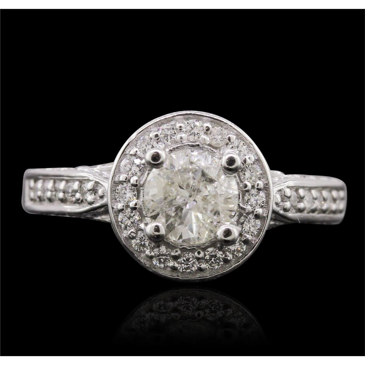 One electronically tested 14KT white gold ladies cast diamond unity ring with a bright polish finish. Condition is new, good workmanship. The featured diamond is set within a diamond bezel supported by diamond set shoulders, completed by a two millimeter wide band. Identified with markings of "14K". Containing: One prong set round brilliant cut diamond, measuring 5.60 - 5.50 x 3.25mm (depth est.) approximate weight of 0.71ct. Graded in the setting. Clarity: I-2 . Color: J Depth 58.6%. Table 64.9%. Fifty-Eight prong set round brilliant cut diamonds, measuring 1.30 - 1.20 x 0.75mm (depth est.) approximate. Total Weight of 58 Stones = 0.51ct. Graded in the setting. Clarity: VS-1 to SI-1 . Color: G - I. Total Weight of Diamonds 1.22ct.. Total Weight of Ring 3.82 grams. AIG Appraised at $6,615.00.