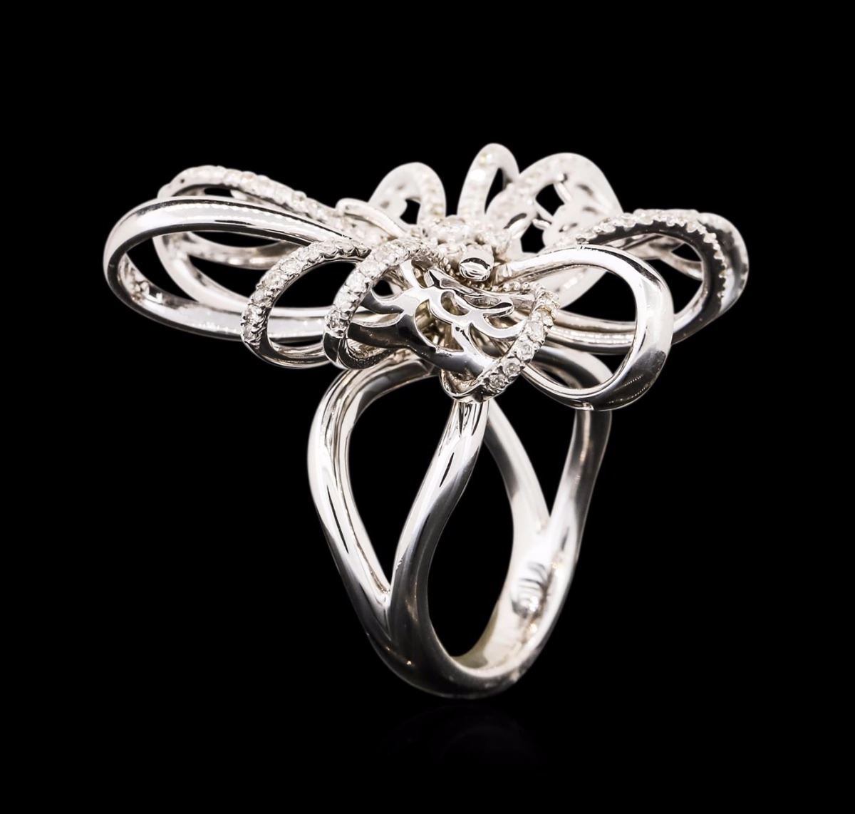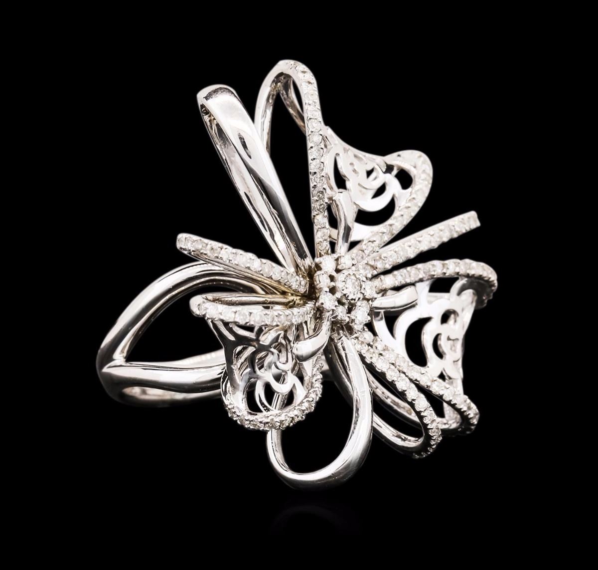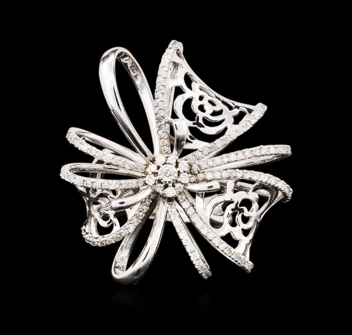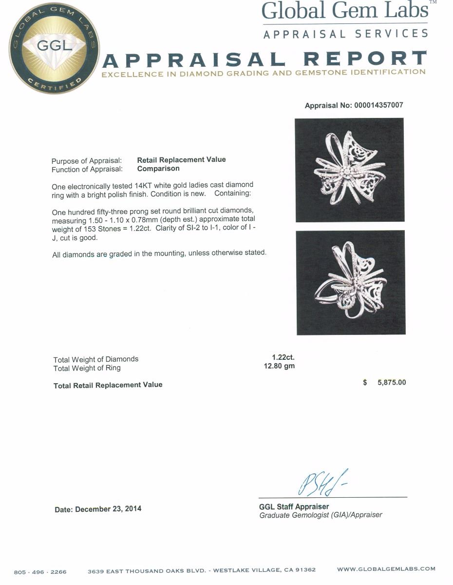 One electronically tested 14KT white gold ladies cast diamond ring with a bright polish finish. Condition is new. Containing: One Hundred Fifty-Three prong set round brilliant cut diamonds, measuring 1.50 - 1.10 x 0.78mm (depth est.) approximate total weight of 153 Stones = 1.22ct. Clarity: SI-2 to I-1. Color: I - J, Cut is Good. All diamonds are graded in the mounting, unless otherwise stated. Total Weight of Diamonds 1.22ct. Total Weight of Ring 12.80 grams. GGL Appraised at $5,875.00.