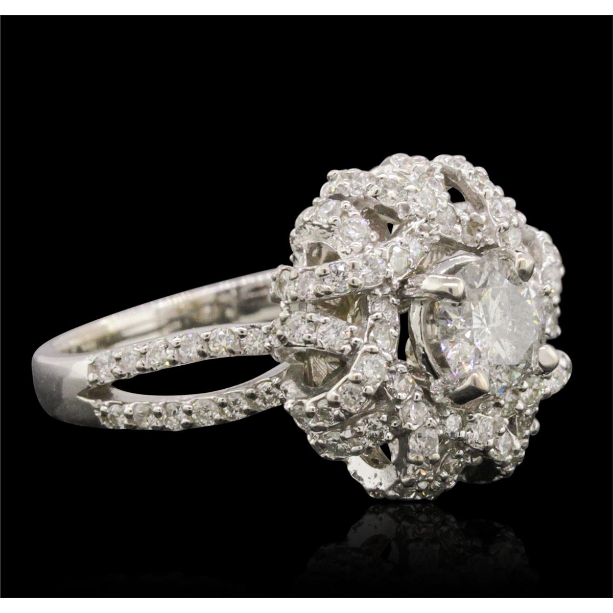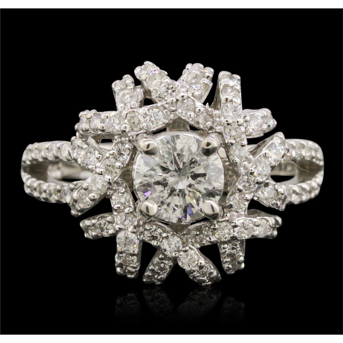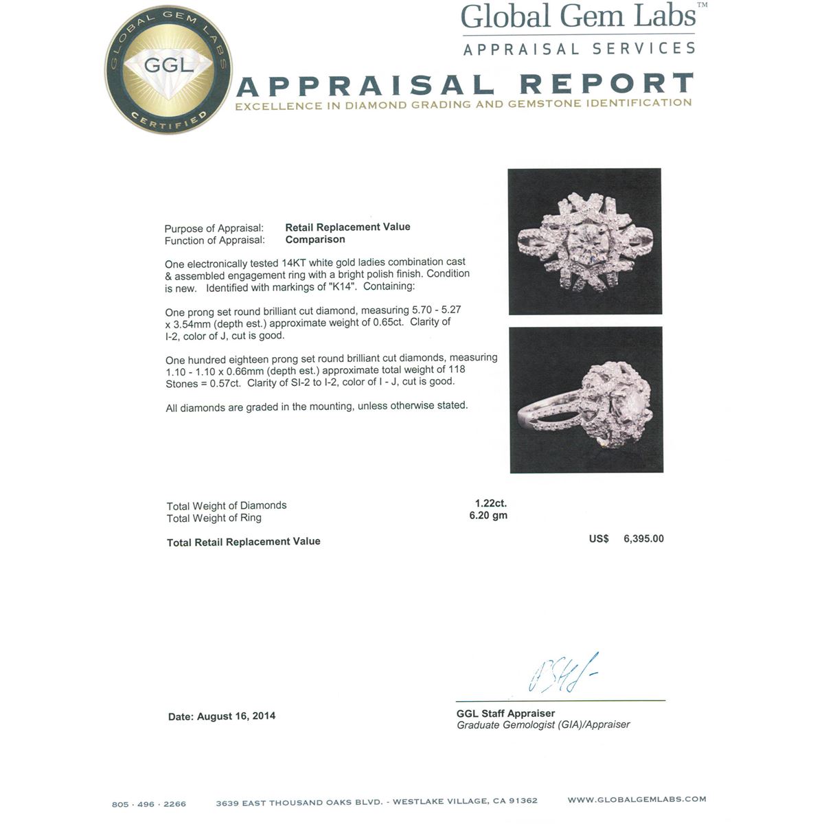 One electronically tested 14KT white gold ladies combination cast & assembled engagement ring with a bright polish finish. Condition is new. Identified with markings of "K14". Containing: One prong set round brilliant cut diamond, measuring 5.70 - 5.27 x 3.54mm (depth est.) approximate weight of 0.65ct. Clarity: I-2. Color: J, Cut is Good. One Hundred Eighteen prong set round brilliant cut diamonds, measuring 1.10 - 1.10 x 0.66mm (depth est.) approximate. Total Weight of 118 Stones = 0.57ct. Clarity: SI-2 to I-2. Color: I - J, Cut is Good. All diamonds are graded in the mounting, unless otherwise stated. Total Weight of Diamonds 1.22ct. Total Weight of Ring 6.20 grams. GGL Appraised at $6,395.00.
