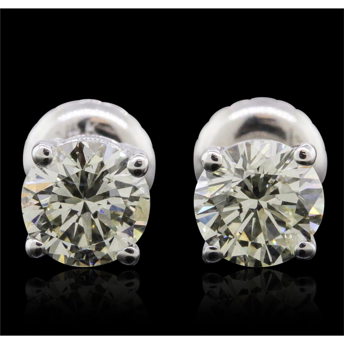 One pair electronically tested 14KT white gold cast & assembled diamond solitaire earrings with screw backs. Bright polish finish. Condition is new, good workmanship. Containing: One prong set round brilliant cut diamond, measuring 5.10 - 5.09 x 3.15mm (depth est.), 3.00% GTCF approximate weight of 0.61ct with a medium blue fluorescence. Graded in the setting. Clarity: I-1. Depth: 61.8%. Table 56.9%. One prong set round brilliant cut diamond, measuring 5.05 - 5.04 x 3.20mm (depth est.), 3.00% GTCF approximate weight of 0.61ct with a medium blue fluorescence. Graded in the setting. Clarity: I-1. Depth: 63.4%. Table 62.4%. Total Weight of Diamonds 1.22ct. Total Weight of Earrings 0.96 grams. AIG Appraised at $3,965.00.