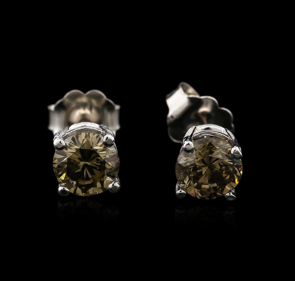 One pair electronically tested 14KT white gold ladies cast diamond stud earrings with friction posts with a bright polish finish. Identified with markings of "14K". Condition is new. Containing: Two prong set round brilliant cut diamonds, measuring 5.50 - 5.50 x 3.30mm (depth est.) approximate total weight of 2 Stones = 1.22ct. Clarity: I-1, Cut is Good. Diamonds are graded in the mounting, unless otherwise stated. Total Weight of Diamonds 1.22ct. Total Weight of Stud Earrings 1.20 grams. GGL Appraised at $2,020.00.
