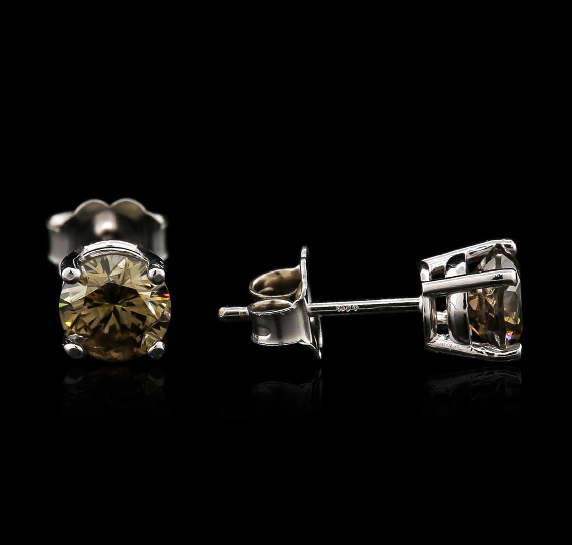 One pair electronically tested 14KT white gold ladies cast diamond stud earrings with friction posts with a bright polish finish. Identified with markings of "14K". Condition is new. Containing: Two prong set round brilliant cut diamonds, measuring 5.50 - 5.50 x 3.30mm (depth est.) approximate total weight of 2 Stones = 1.22ct. Clarity: I-1, Cut is Good. Diamonds are graded in the mounting, unless otherwise stated. Total Weight of Diamonds 1.22ct. Total Weight of Stud Earrings 1.20 grams. GGL Appraised at $2,385.00.