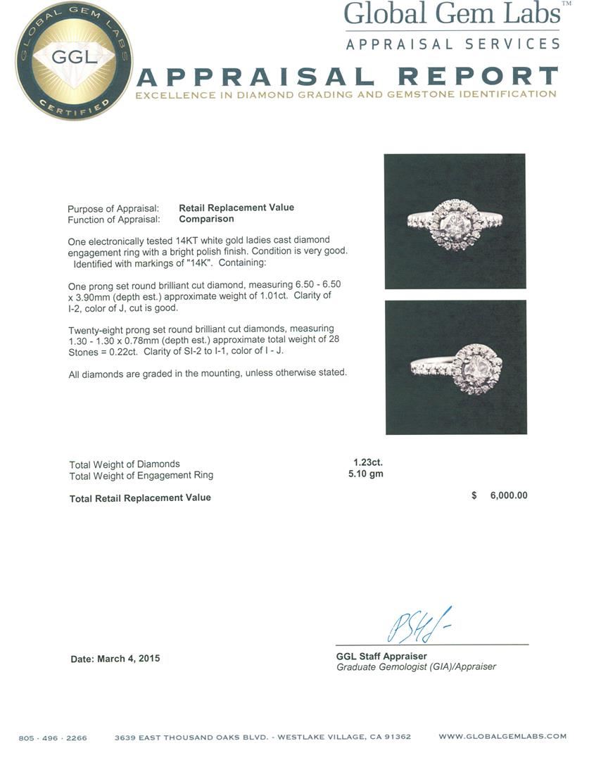 One electronically tested 14KT white gold ladies cast diamond engagement ring with a bright polish finish. Identified with markings of "14K". Condition is very good. Containing: One prong set round brilliant cut diamond, measuring 6.50 - 6.50 x 3.90mm (depth est.) approximate weight of 1.01ct. Clarity: I-2. Color: J, Cut is Good. Twenty-Eight prong set round brilliant cut diamonds, measuring 1.30 - 1.30 x 0.78mm (depth est.) approximate total weight of 28 Stones = 0.22ct. Clarity: SI-2 to I-1. Color: I - J. All diamonds are graded in the mounting, unless otherwise stated. Total Weight of Diamonds 1.23ct. Total Weight of Engagement Ring 5.10 grams. GGL Appraised at $6,000.00.