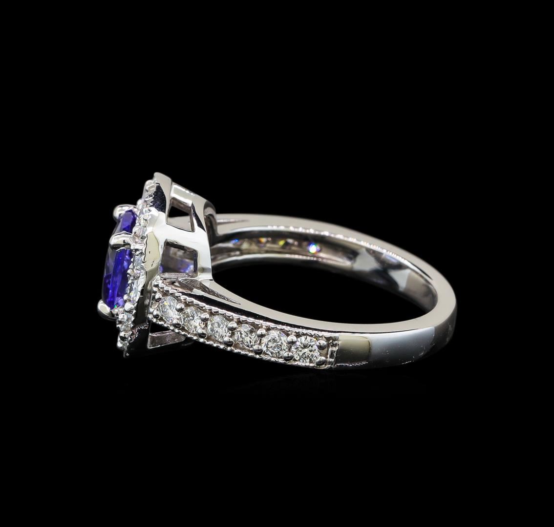 One electronically tested 14KT white gold ladies cast tanzanite and diamond ring with a bright polish finish. Identified with markings of "14K". Condition is new. Containing: One prong set square cushion modified brilliant cut natural tanzanite, measuring 6.50 x 6.50 x 4.23mm, approximate weight of 1.23ct., clarity is eye clean, type I, medium, moderately strong, violet color, (GIA V 5/4), cut is good. Twenty-Eight prong set round brilliant cut diamonds, measuring 1.60 - 1.60 x 0.96mm (depth est.) approximate total weight of 28 Stones = 0.52ct. Clarity: SI-1 to SI-2. Color: I - J, Cut is Good. Colored gemstones are presumed to have been subjected to commonly used enhancement processes. All diamonds and colored gemstones are graded in the mounting, unless otherwise stated. Total Weight of Colored Stones 1.23ct. Total Weight of Diamonds 0.52ct. Total Weight of Ring 5.80 grams. GGL Appraised at $3,530.00.