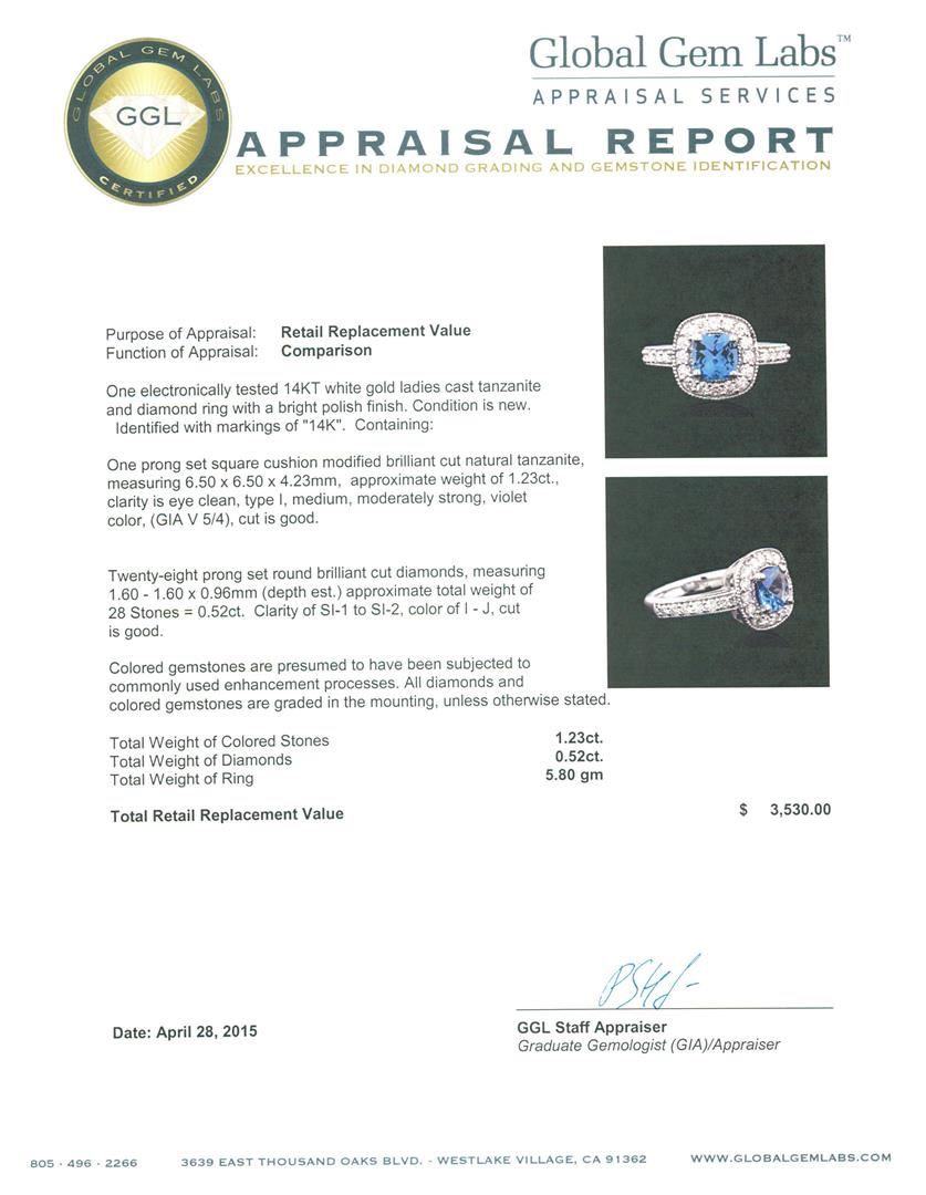 One electronically tested 14KT white gold ladies cast tanzanite and diamond ring with a bright polish finish. Identified with markings of "14K". Condition is new. Containing: One prong set square cushion modified brilliant cut natural tanzanite, measuring 6.50 x 6.50 x 4.23mm, approximate weight of 1.23ct., clarity is eye clean, type I, medium, moderately strong, violet color, (GIA V 5/4), cut is good. Twenty-Eight prong set round brilliant cut diamonds, measuring 1.60 - 1.60 x 0.96mm (depth est.) approximate total weight of 28 Stones = 0.52ct. Clarity: SI-1 to SI-2. Color: I - J, Cut is Good. Colored gemstones are presumed to have been subjected to commonly used enhancement processes. All diamonds and colored gemstones are graded in the mounting, unless otherwise stated. Total Weight of Colored Stones 1.23ct. Total Weight of Diamonds 0.52ct. Total Weight of Ring 5.80 grams. GGL Appraised at $3,530.00.