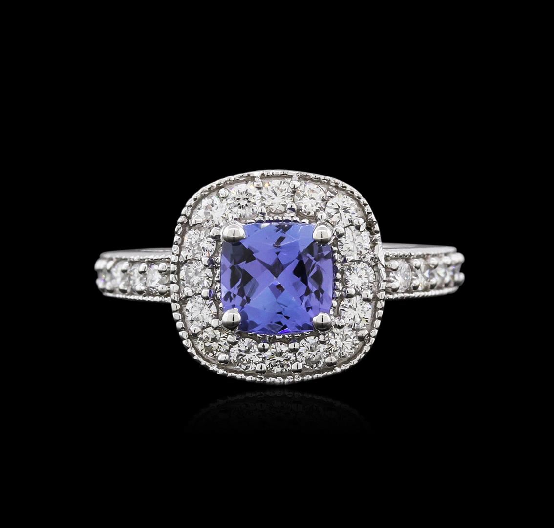 One electronically tested 14KT white gold ladies cast tanzanite and diamond ring with a bright polish finish. Identified with markings of "14K". Condition is new. Containing: One prong set square cushion modified brilliant cut natural tanzanite, measuring 6.50 x 6.50 x 4.23mm, approximate weight of 1.23ct., clarity is eye clean, type I, medium, moderately strong, violet color, (GIA V 5/4), cut is good. Twenty-Eight prong set round brilliant cut diamonds, measuring 1.60 - 1.60 x 0.96mm (depth est.) approximate total weight of 28 Stones = 0.52ct. Clarity: SI-1 to SI-2. Color: I - J, Cut is Good. Colored gemstones are presumed to have been subjected to commonly used enhancement processes. All diamonds and colored gemstones are graded in the mounting, unless otherwise stated. Total Weight of Colored Stones 1.23ct. Total Weight of Diamonds 0.52ct. Total Weight of Ring 5.80 grams. GGL Appraised at $3,530.00.