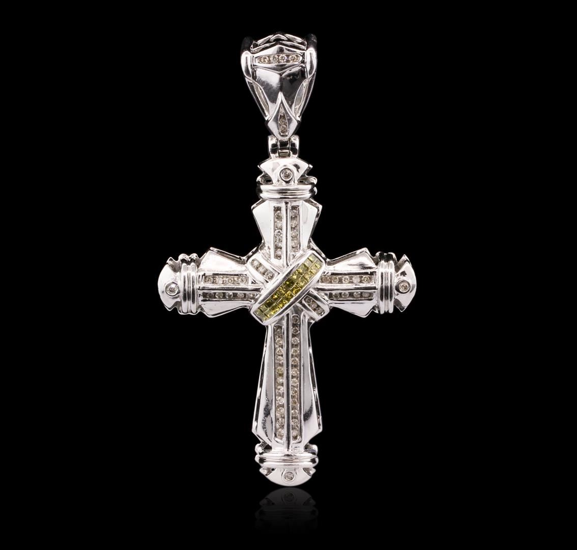 One electronically tested 14KT white gold unisex cast diamond cross pendant with a bright polish finish. Trademark is JPM. Identified with markings of "14K". Condition is very good. Containing: Sixty-Six channel set round brilliant cut diamonds, measuring 1.50 - 1.50 x 0.90mm (depth est.) approximate total weight of 66 Stones = 0.81ct. Clarity: SI-2 to I-2. Color: J - K, Cut is Good. Twenty channel set princess cut diamonds, measuring 1.50 x 1.50 x 1.13mm (depth est.) approximate total weight of 20 Stones = 0.42ct. Clarity: SI-1 to SI-2, Color is Fancy Greenish Yellow, Cut is Good. The color of the stones has been enhanced. All diamonds are graded in the mounting, unless otherwise stated. Total Weight of Diamonds 1.23ct. Total Weight of Cross Pendant 27.20 grams. GGL Appraised at $6,505.00.