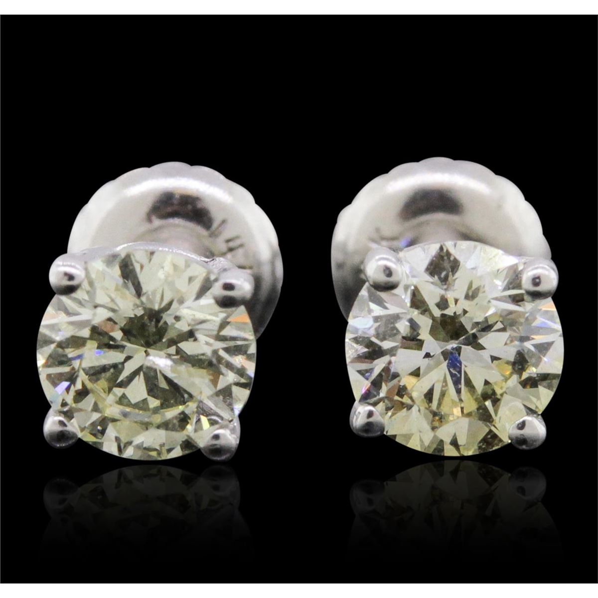 One pair electronically tested 14KT white gold cast & assembled diamond solitaire earrings with screw backs. Bright polish finish. Condition is new, good workmanship. Containing: One prong set round brilliant cut diamond, measuring 5.15 - 5.10 x 3.30mm (depth est.) approximate weight of 0.63ct with a medium strong yellow fluorescence. Graded in the setting. Clarity: SI-2. Depth: 64.3%. Table 58.5%. One prong set round brilliant cut diamond, measuring 5.10 - 5.05 x 3.10mm (depth est.), 4.00% GTCF approximate weight of 0.60ct with a medium blue fluorescence. Graded in the setting. Clarity: I-1. Depth: 61.1%. Table 60.2%. Total Weight of Diamonds 1.23ct. Total Weight of Earrings 0.95 grams. AIG Appraised at $4,095.00.