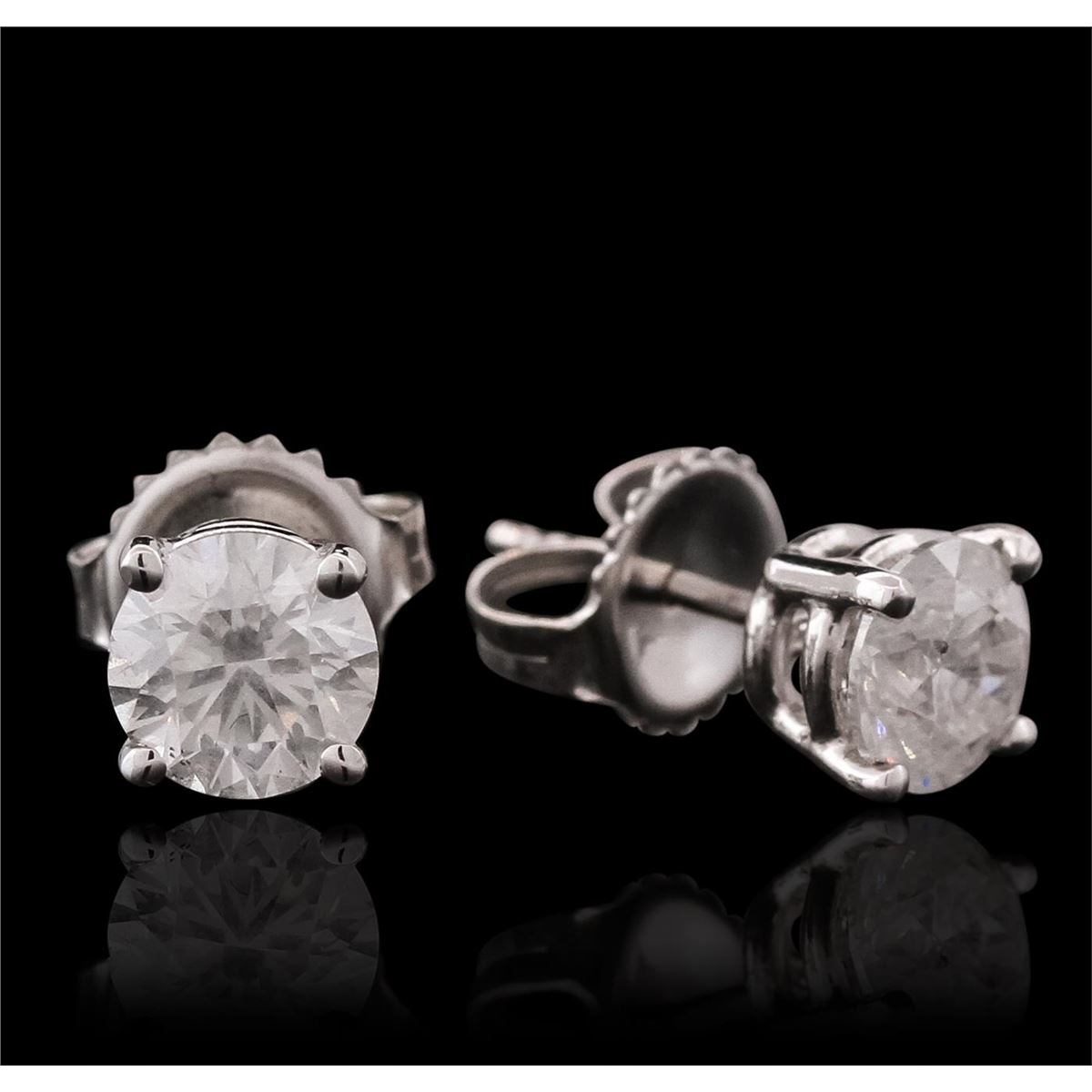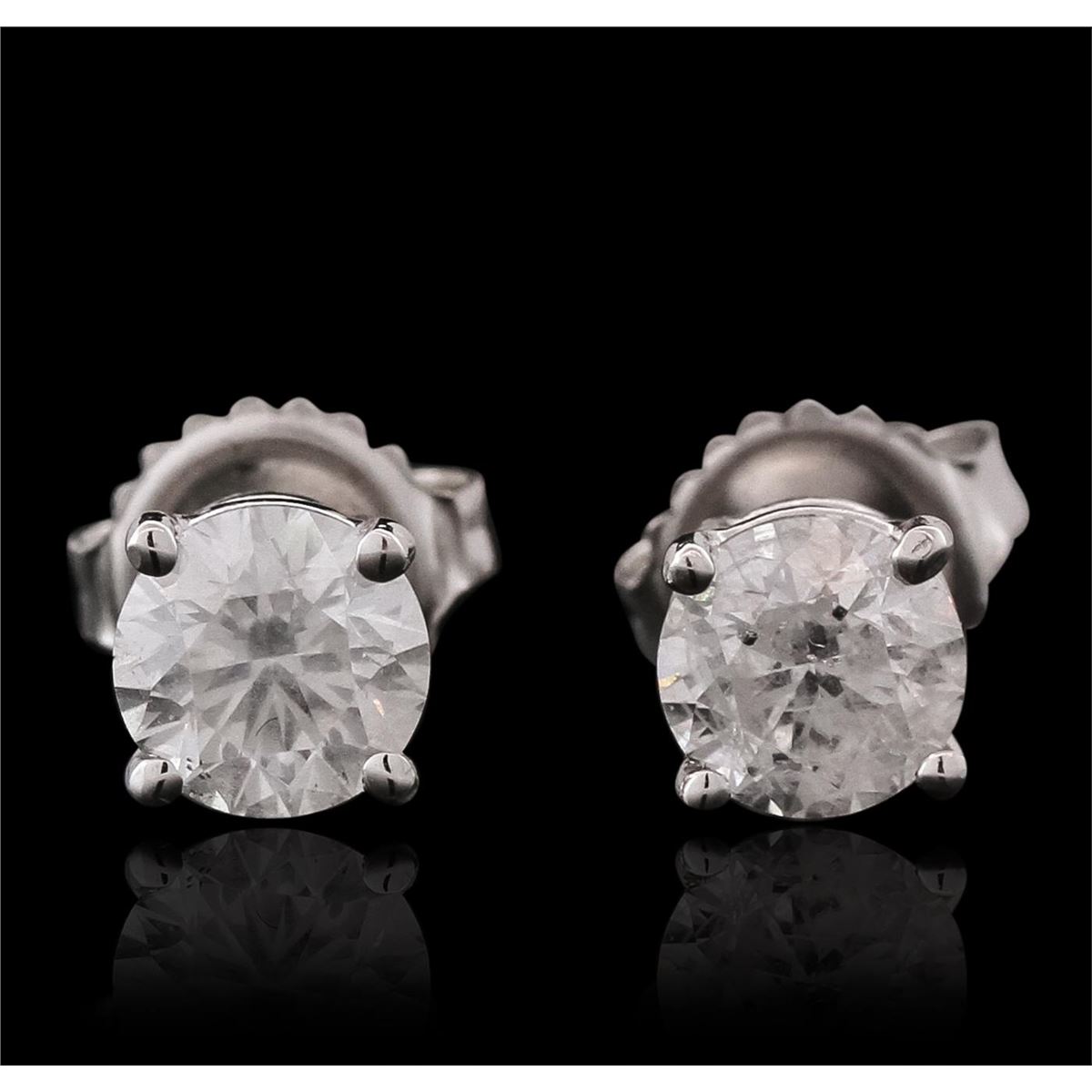 One pair electronically tested 14KT white gold ladies cast stud earrings with friction posts with a bright polish finish. Identified with markings of "14K". Condition is new. Containing: One prong set round brilliant cut diamond, measuring 5.58 - 5.60 x 3.33mm (depth est.) approximate weight of 0.64ct. Clarity: I-3. Color: G, Cut is Good. One prong set round brilliant cut diamond, measuring 5.48 - 5.47 x 3.31mm (depth est.) approximate weight of 0.61ct. Clarity: I-2. Color: H, Cut is Good. All diamonds are graded in the mounting, unless otherwise stated total weight of Diamonds 1.24ct. Total Weight of Earrings 1.60 grams. GGL Appraised at $5,540.00.