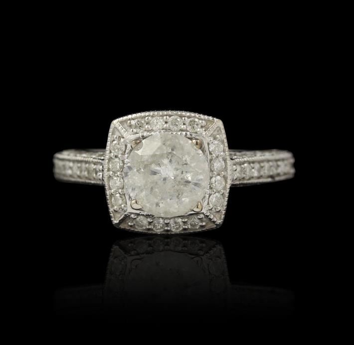 14KT White Gold 1.24ct Diamond Ring A4739 . One electronically tested 14KT white gold ladies cast diamond unity ring. Condition is good. The featured diamond is set within a diamond bezel supported by diamond set shoulders, completed by a two millimeter wide band. Bright polish finish with milgrain detailing. Identified with markings "14K". Containing: One prong set round brilliant cut diamond, measuring 7.00 - 6.90 x 4.00mm (depth est.), 5.00% GTCF approximate weight of 1.24ct with a faint blue fluorescence. Graded in the setting. Clarity I-2. Color I. Depth 57.6%. Table 64.8%. Seventy-six bead set round brilliant cut diamonds, measuring 1.30 - 1.20 x 0.75mm (depth est.) approximate total weight of 76 Stones = 0.61. Graded in the setting. Clarity I-1. Color H - I. Total Weight of Diamonds 1.85ct. Total Weight of Ring 4.61 gm. Total AIG Appraised at $13,570.00.