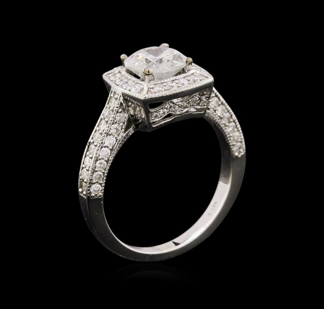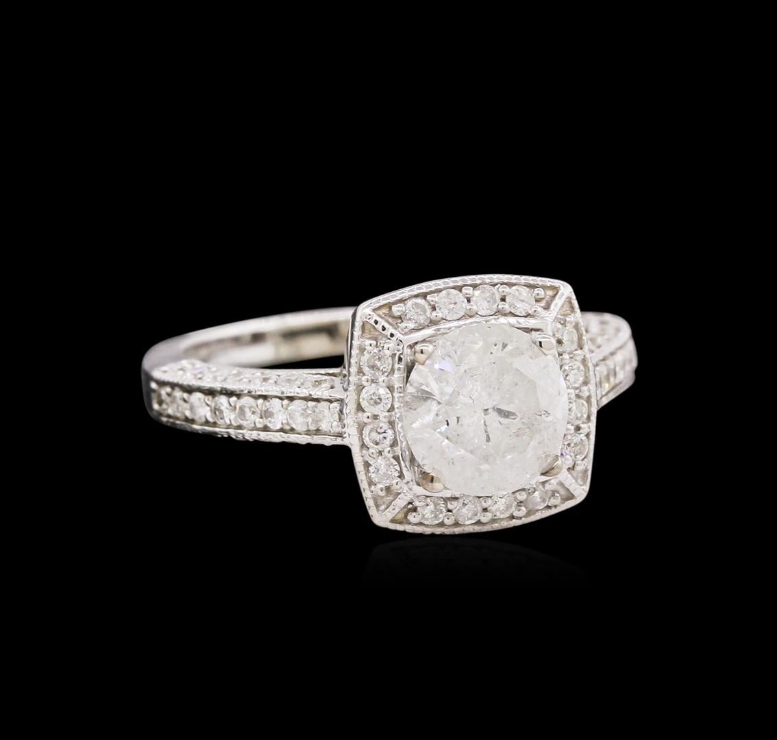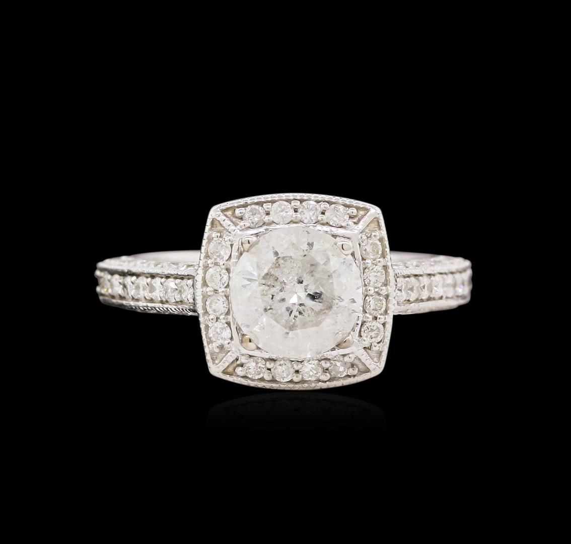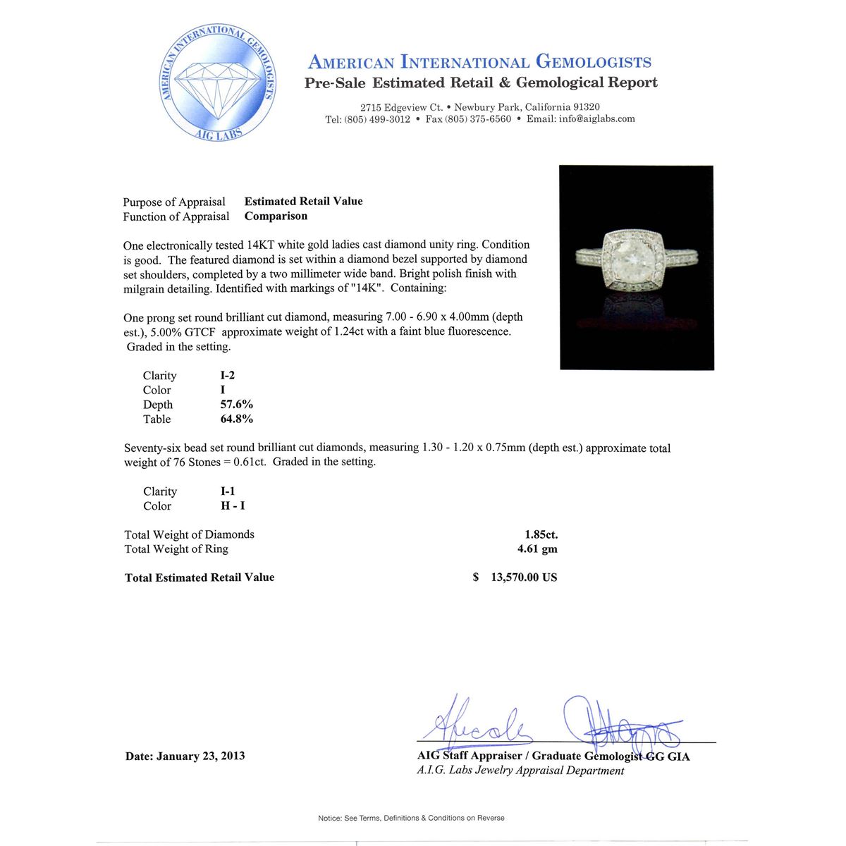 14KT White Gold 1.24ct Diamond Ring A4739 . One electronically tested 14KT white gold ladies cast diamond unity ring. Condition is good. The featured diamond is set within a diamond bezel supported by diamond set shoulders, completed by a two millimeter wide band. Bright polish finish with milgrain detailing. Identified with markings "14K". Containing: One prong set round brilliant cut diamond, measuring 7.00 -- 6.90 x 4.00mm (depth est.), 5.00% GTCF approximate weight of 1.24ct with a faint blue fluorescence. Graded in the setting. Clarity I-2. Color I. Depth 57.6%. Table 64.8%. Seventy-six bead set round brilliant cut diamonds, measuring 1.30 -- 1.20 x 0.75mm (depth est.) approximate total weight of 76 Stones = 0.61. Graded in the setting. Clarity I-1. Color H -- I. Total Weight of Diamonds 1.85ct. Total Weight of Ring 4.61 gm. Total AIG Appraised at $13,570.00.