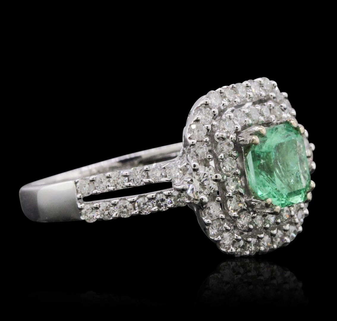 one-half millimeter wide band. Containing: One prong set square step cut natural emerald, measuring 6.45 x 6.40 x 4.18mm, 6% bulge factor, approximate weight of 1.24ct., clarity is moderately included, type III, medium dark, moderately strong, very slightly bluish green color, (GIA vslbG 6/4), cut is good. Transmitting light with a minimum of distortion, transparent. Naturally occurring internal & external characteristics are present. Indications of oil residue. Graded in the setting. Sixty-Six post set round brilliant cut diamonds, measuring 1.60 - 1.50 x 0.93mm (depth est.) approximate total weight of 66 Stones = 1.05ct. Graded in the setting. Clarity: SI-1 to I-1. Color: G - I AIG Appraised at $6,080.00.