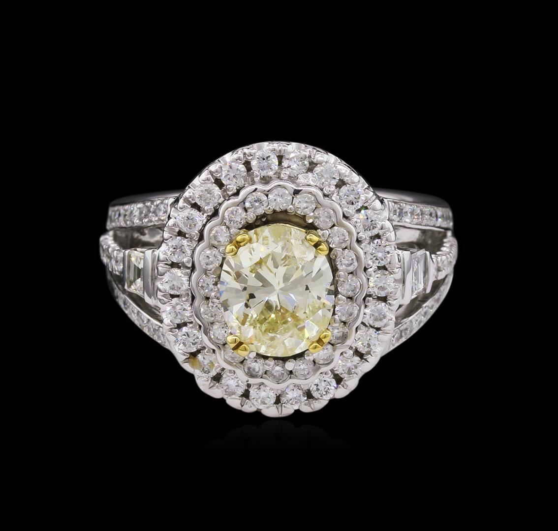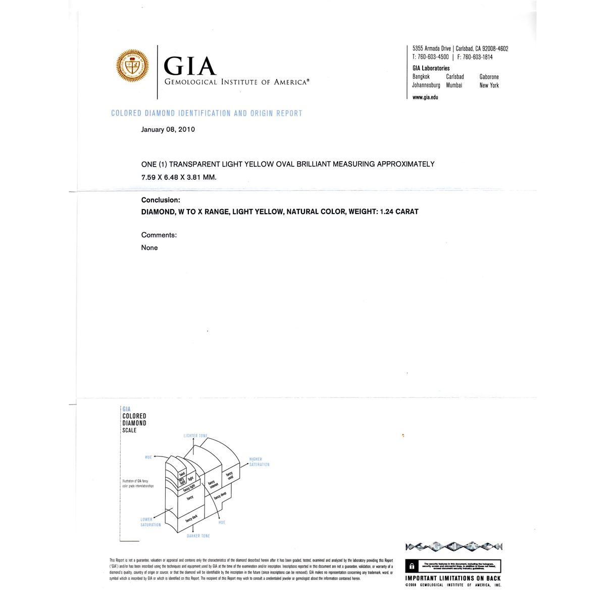 One electronically tested 14KT white gold ladies cast diamond unity ring. Condition is new, good workmanship. The featured diamond is set within a tiered diamond bezel supported by elaborate diamond set three-way split shoulders, completed by a three millimeter wide band. Bright polish finish with yellow gold accents. Identified with markings of "14K". Containing: One prong set oval shaped cut diamond, measuring 7.59 x 6.48 x 3.81mm exact weight 1.24ct with a medium strong blue fluorescence. Diamond Grading Report attached. Graded loose for color prior to setting in the GIA Laboratory, Report #6117543399. Clarity I-1. Color Light Yellow. Depth 58.8%. Table 55.6%. Eighty-six prong set round brilliant cut diamonds, measuring 1.60 - 1.10 x 0.81mm (depth est.) approximate total weight of 86 Stones = 0.81ct. Graded in the setting. Clarity VS-2 to SI - 2. Color G - I Two channel set baguette cut diamonds, measuring from 0.00 x 0.00 x 1.47mm (depth est.) to 2.70 x 1.90 x 0.00mm (depth est.) approximate total weight of 2 Stones = 0.15ct. Graded in the setting. Clarity VS-1. Color H -- I. Total weight of Diamond 2.20ct. Total weight of Ring 9.45gm. AIG Appraised at $10,995.00.