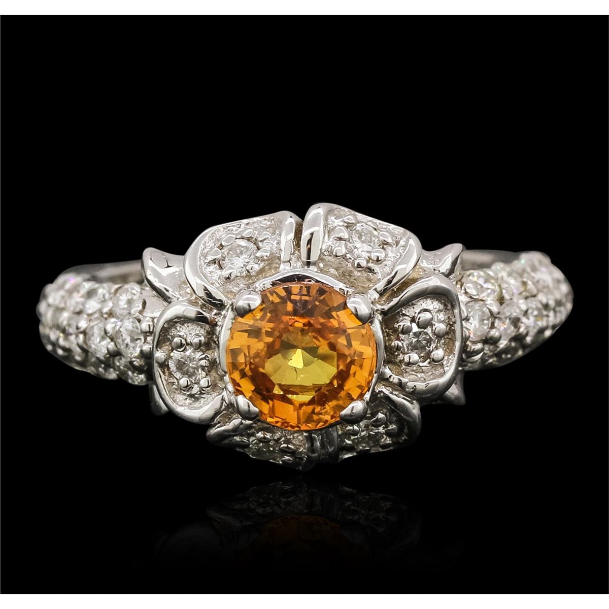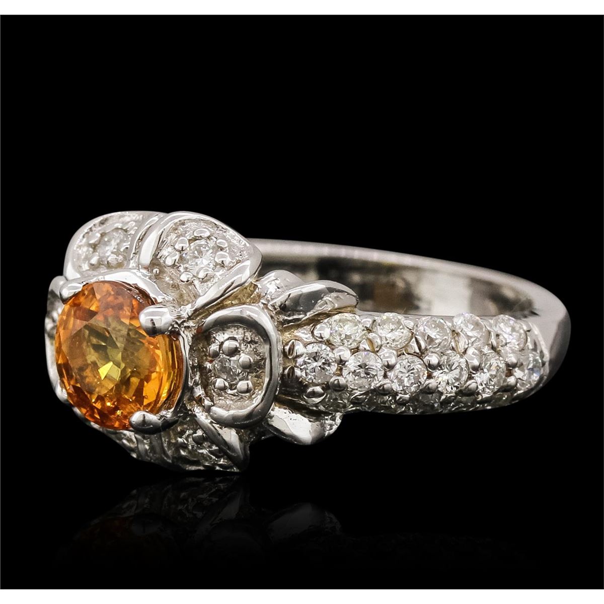 One electronically tested 14KT white gold ladies cast yellow sapphire & diamond ring with a bright finish. The featured yellow sapphire is set within a floral designed diamond gallery, supported by diamond set shoulders, completed by a three millimeter wide band. Identified with markings of "14K". Condition is new, good workmanship. Containing: One prong set round mixed cut natural yellow sapphire, measuring 6.00 - 6.00 x 3.78 mm, 8%. bulge factor, approximate weight of 1.24ct., clarity is heavily included, type II, medium, brownish, orangy yellow color, (GIA oY 5/1), cut is good. Refractive index testing results of 1.76 to 177. This is a conclusive result for sapphire. Transmitting light with a minimum of distortion, transparent. Internal & external characteristics are present. Graded in the setting. Thirty-Eight prong set round brilliant cut diamonds, measuring 1.80 - 1.70 x 1.05mm (depth est.) approximate. Total Weight of 38 Stones = 0.78ct. Graded in the setting. Clarity: SI-1 to I-1. Color: H - I. Total Weight of Colored Stones 1.24ct. Total Weight of Diamonds 0.78ct. Total Weight of Ring 6.27gm. AIG Appraised at $3,680.00.