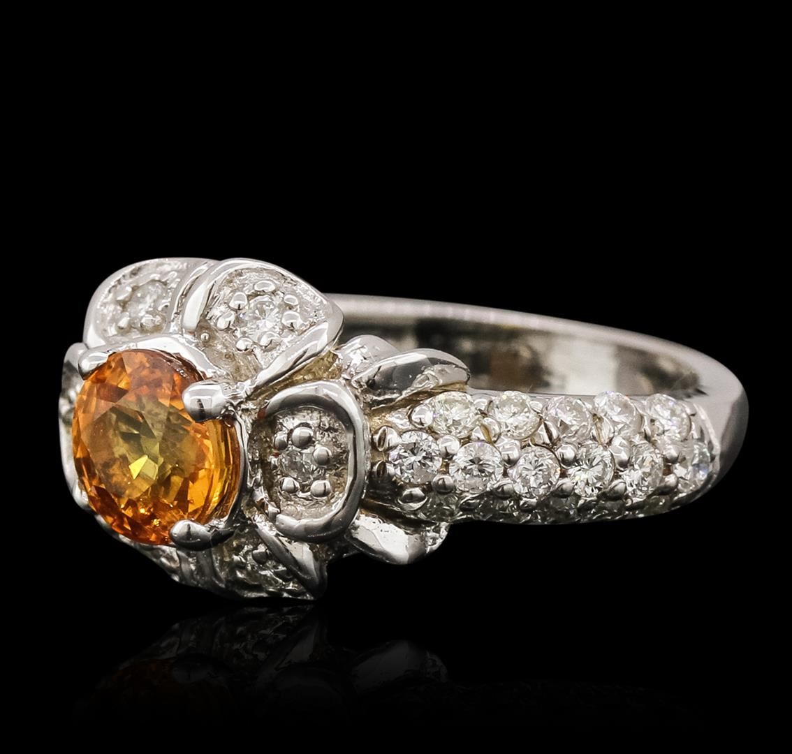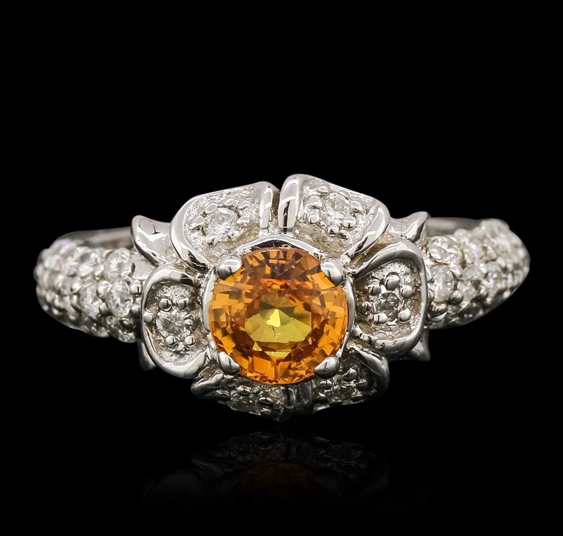 One electronically tested 14KT white gold ladies cast yellow sapphire & diamond ring with a bright finish. The featured yellow sapphire is set within a floral designed diamond gallery, supported by diamond set shoulders, completed by a three millimeter wide band. Identified with markings of "14K". Condition is new, good workmanship. Containing: One prong set round mixed cut natural yellow sapphire, measuring 6.00 - 6.00 x 3.78 mm, 8%. bulge factor, approximate weight of 1.24ct., clarity is heavily included, type II, medium, brownish, orangy yellow color, (GIA oY 5/1), cut is good. Refractive index testing results of 1.76 to 177. This is a conclusive result for sapphire. Transmitting light with a minimum of distortion, transparent. Internal & external characteristics are present. Graded in the setting. Thirty-Eight prong set round brilliant cut diamonds, measuring 1.80 - 1.70 x 1.05mm (depth est.) approximate. Total Weight of 38 Stones = 0.78ct. Graded in the setting. Clarity: SI-1 to I-1. Color: H - I. Total Weight of Colored Stones 1.24ct. Total Weight of Diamonds 0.78ct. Total Weight of Ring 6.27gm. AIG Appraised at $3,680.00.