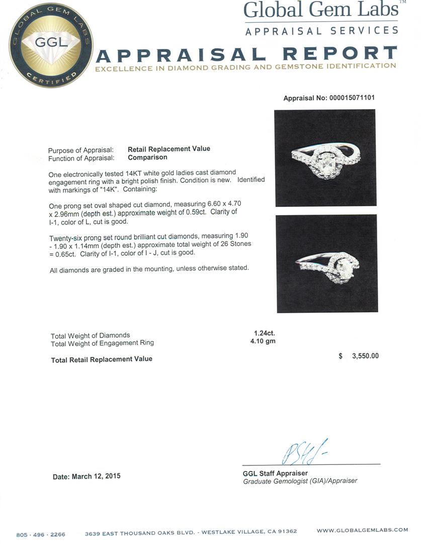 One electronically tested 14KT white gold ladies cast diamond engagement ring with a bright polish finish. Identified with markings of "14K". Condition is new. Containing: One prong set oval shaped cut diamond, measuring 6.60 x 4.70 x 2.96mm (depth est.) approximate weight of 0.59ct. Clarity: I-1. Color: L, Cut is Good. Twenty-Six prong set round brilliant cut diamonds, measuring 1.90 - 1.90 x 1.14mm (depth est.) approximate total weight of 26 Stones = 0.65ct. Clarity: I-1. Color: I - J, Cut is Good. All diamonds are graded in the mounting, unless otherwise stated. Total Weight of Diamonds 1.24ct. Total Weight of Engagement Ring 4.10 grams. GGL Appraised at $3,550.00.