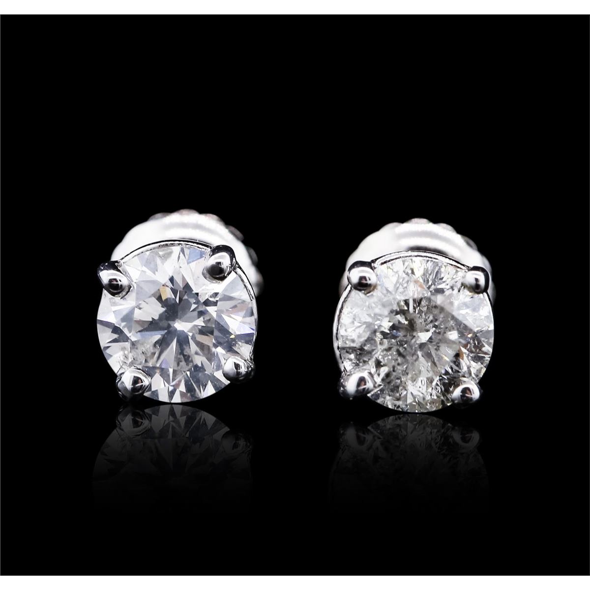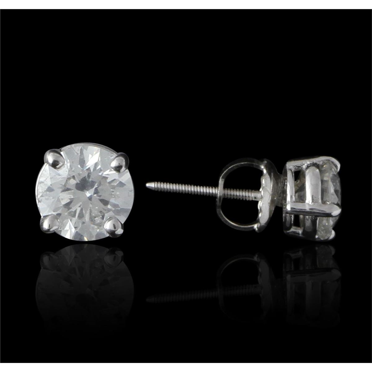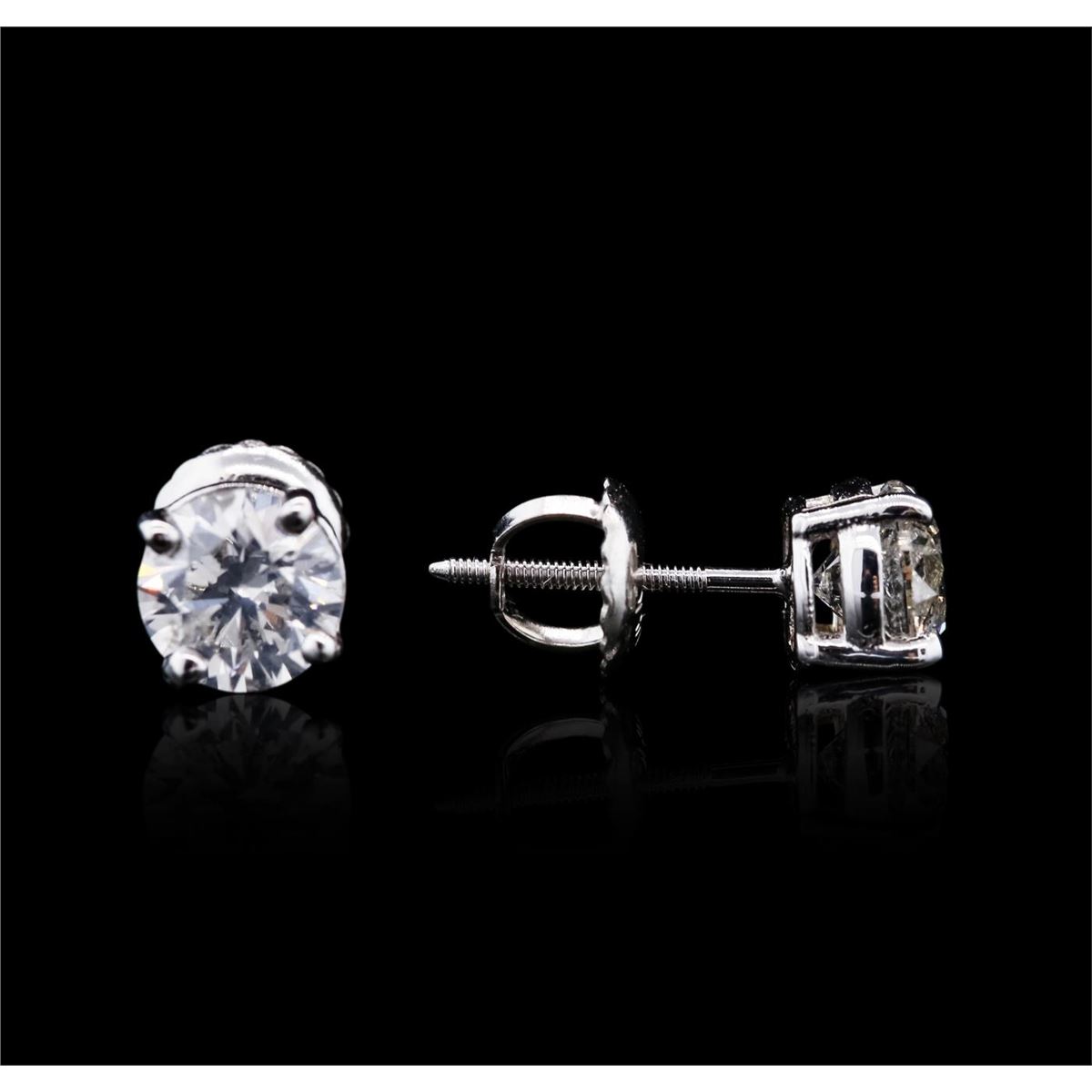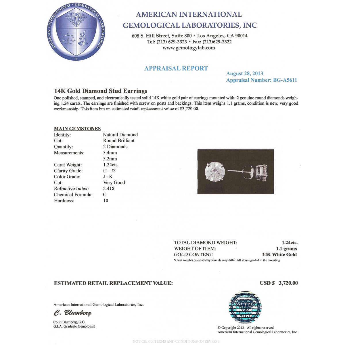 One polished, stamped, and electronically tested solid 14KT White Gold pair of earrings mounted with: 2 genuine round diamonds weighing 1.24 carats. The earrings are finished with screw on posts and backings. This item weighs 1.1 grams, condition is new, very good workmanship. AIGL Appraised at $3,720.00.