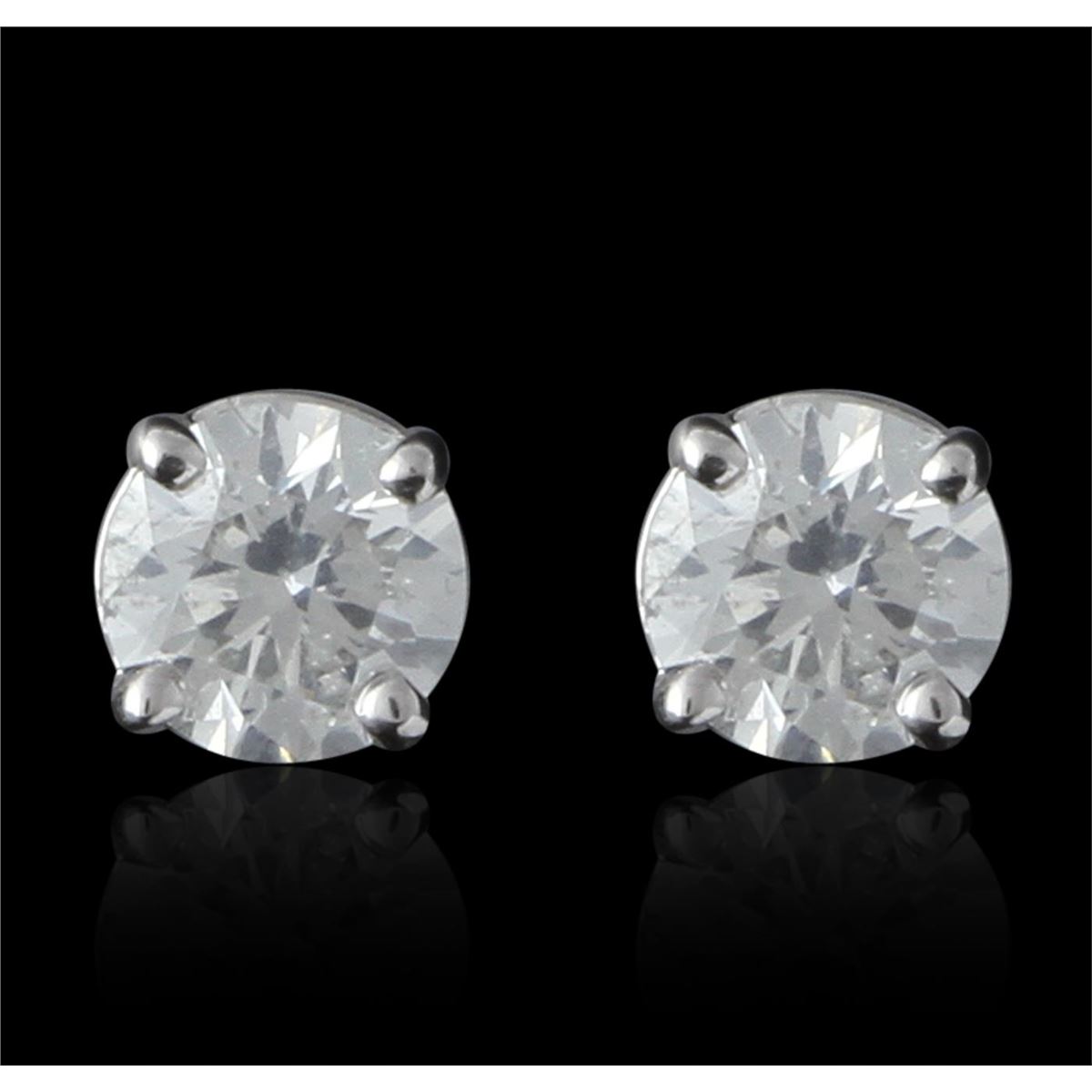 One polished, stamped, and electronically tested solid 14KT White Gold pair of earrings mounted with: 2 genuine round diamonds weighing 1.24 carats. The earrings are finished with screw on posts and backings. This item weighs 1.1 grams, condition is new, very good workmanship. AIGL Appraised at $3,720.00.