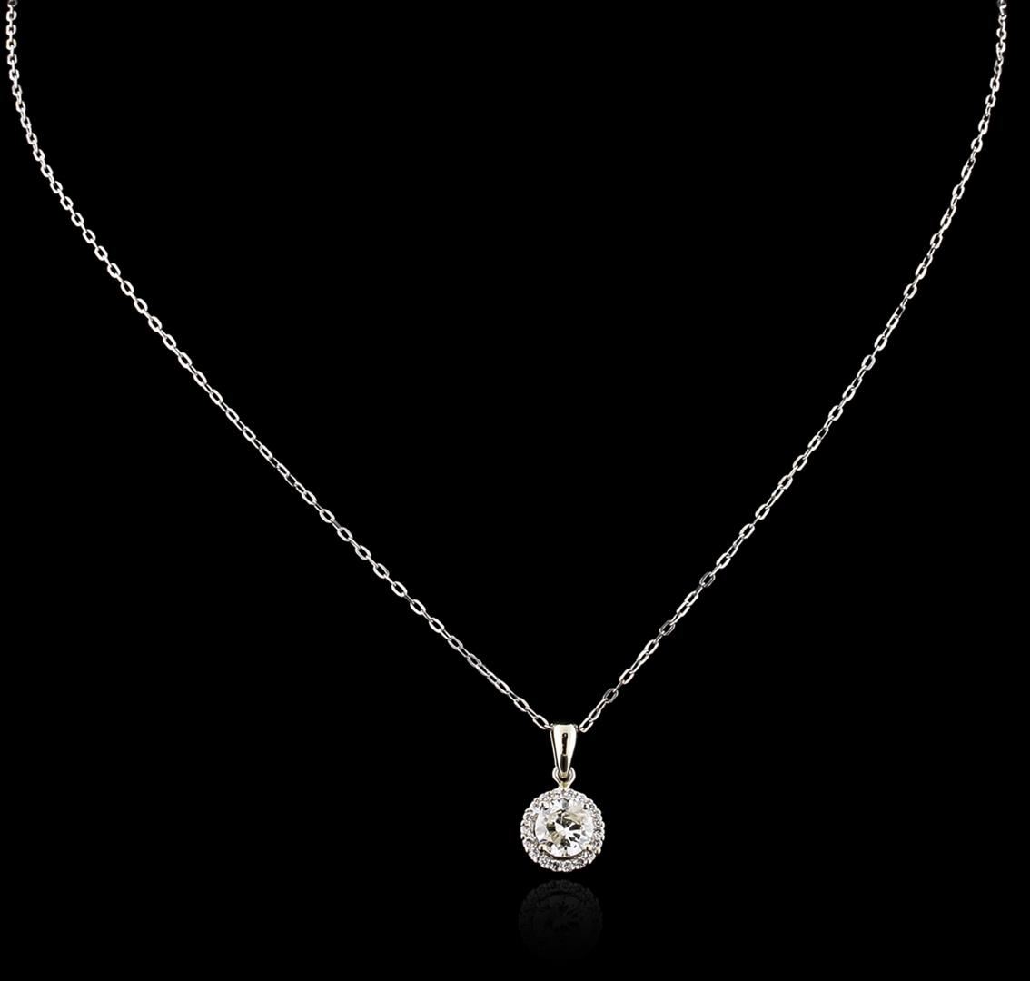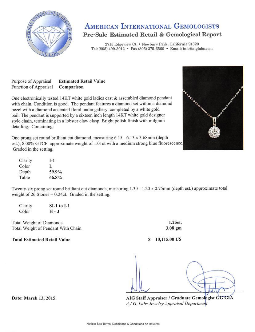 One electronically tested 14KT white gold ladies cast & assembled diamond pendant with chain. The pendant features a diamond set within a diamond bezel with a diamond accented floral under gallery, completed by a white gold bail. The pendant is supported by a sixteen inch length 14KT white gold designer style chain, terminating in a lobster claw clasp. Bright polish finish with milgrain detailing. Condition is good. Containing: One prong set round brilliant cut diamond, measuring 6.15 - 6.13 x 3.68mm (depth est.), 8.00.%. GTCF approximate weight of 1.01ct with a medium strong blue fluorescence. Graded in the setting. Clarity: I-1. Color: L. Depth 59.9%. Table 66.8%. Twenty-Six prong set round brilliant cut diamonds, measuring 1.30 - 1.20 x 0.75mm (depth est.) approximate total weight of 26 Stones = 0.24ct. Graded in the setting. Clarity: SI-1 to I-1. Color: H - J. Total Weight of Diamonds 1.25ct. Total Weight of Pendant With Chain 3.08 grams. AIG Appraised at $10,115.00.