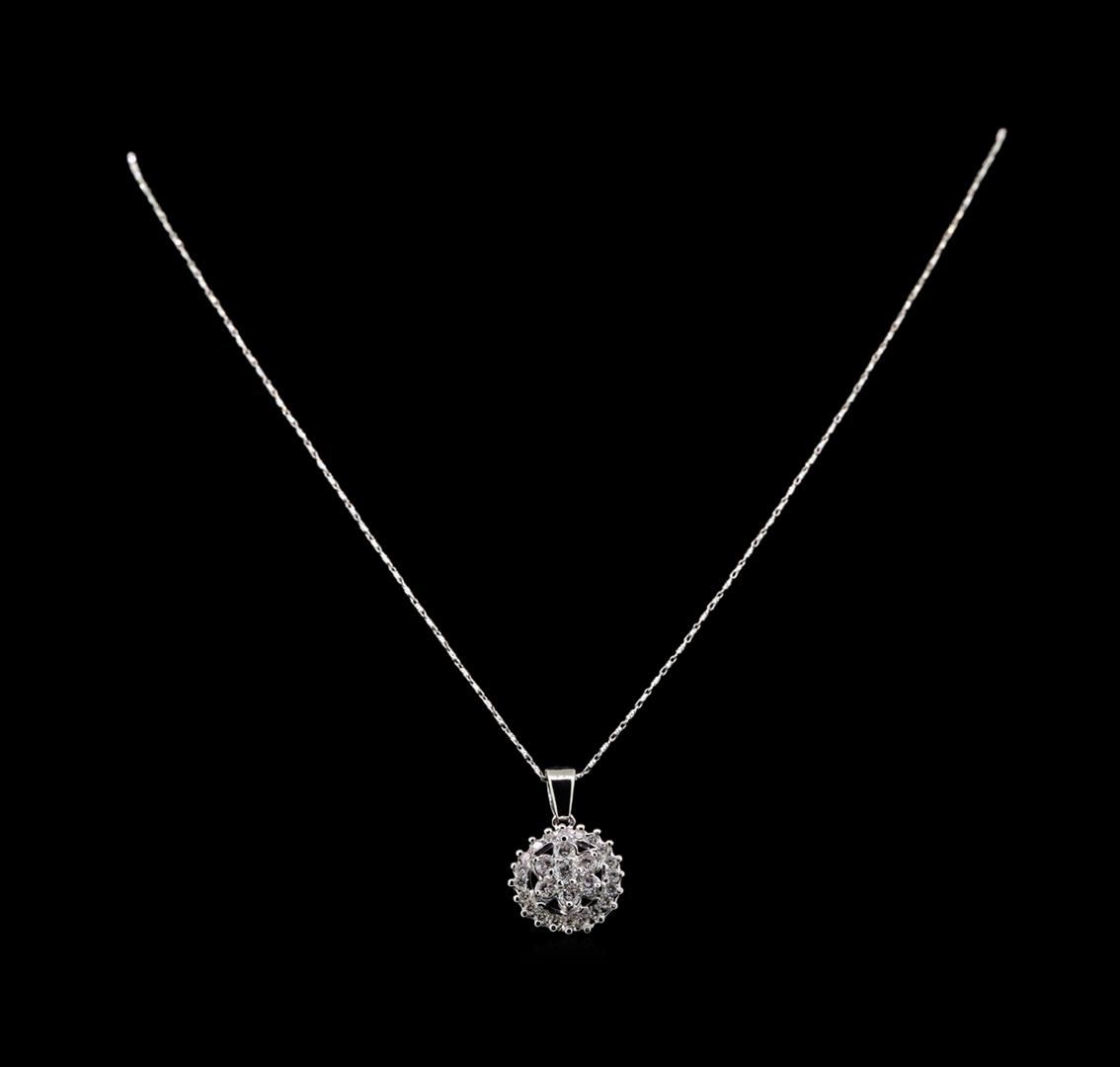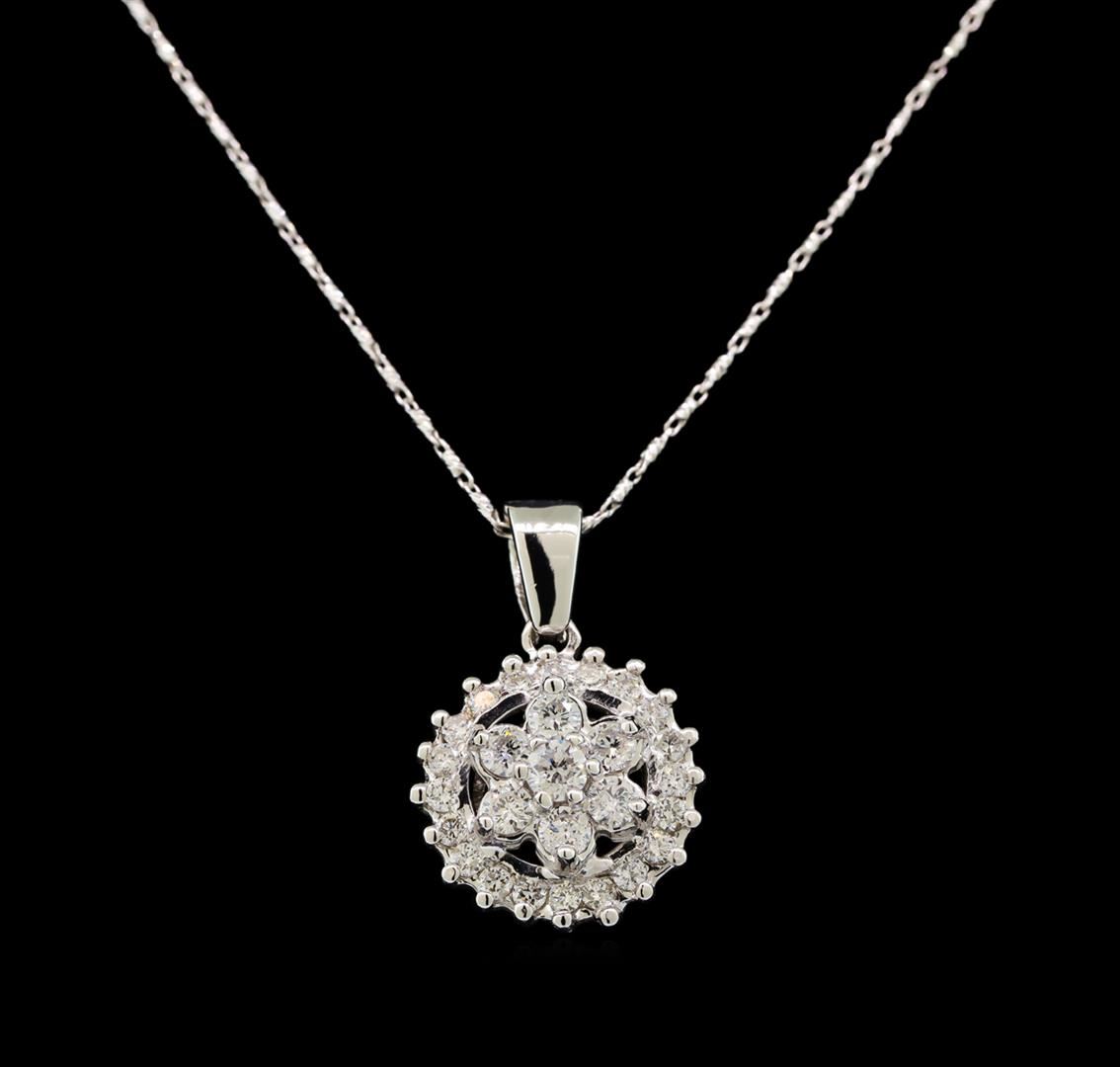 One electronically tested 14KT white gold ladies cast diamond pendant & chain 18.0" long, with a spring ring clasp with a bright polish finish. Identified with markings of "14K". Condition is new. Containing: Seven prong set round brilliant cut diamonds, measuring 3.40 - 3.40 x 2.04mm (depth est.) approximate total weight of 7 Stones = 1.01ct. Clarity: SI-2 to I-1. Color: G - H, Cut is Good. Twenty prong set round brilliant cut diamonds, measuring 1.50 - 1.50 x 0.90mm (depth est.) approximate total weight of 20 Stones = 0.25ct. Clarity: SI-1 to I-1. Color: I - J, Cut is Good. All diamonds are graded in the mounting, unless otherwise stated. Total Weight of Diamonds 1.25ct. Total Weight of Pendant & Chain 6.60 grams. GGL Appraised at $3,985.00.