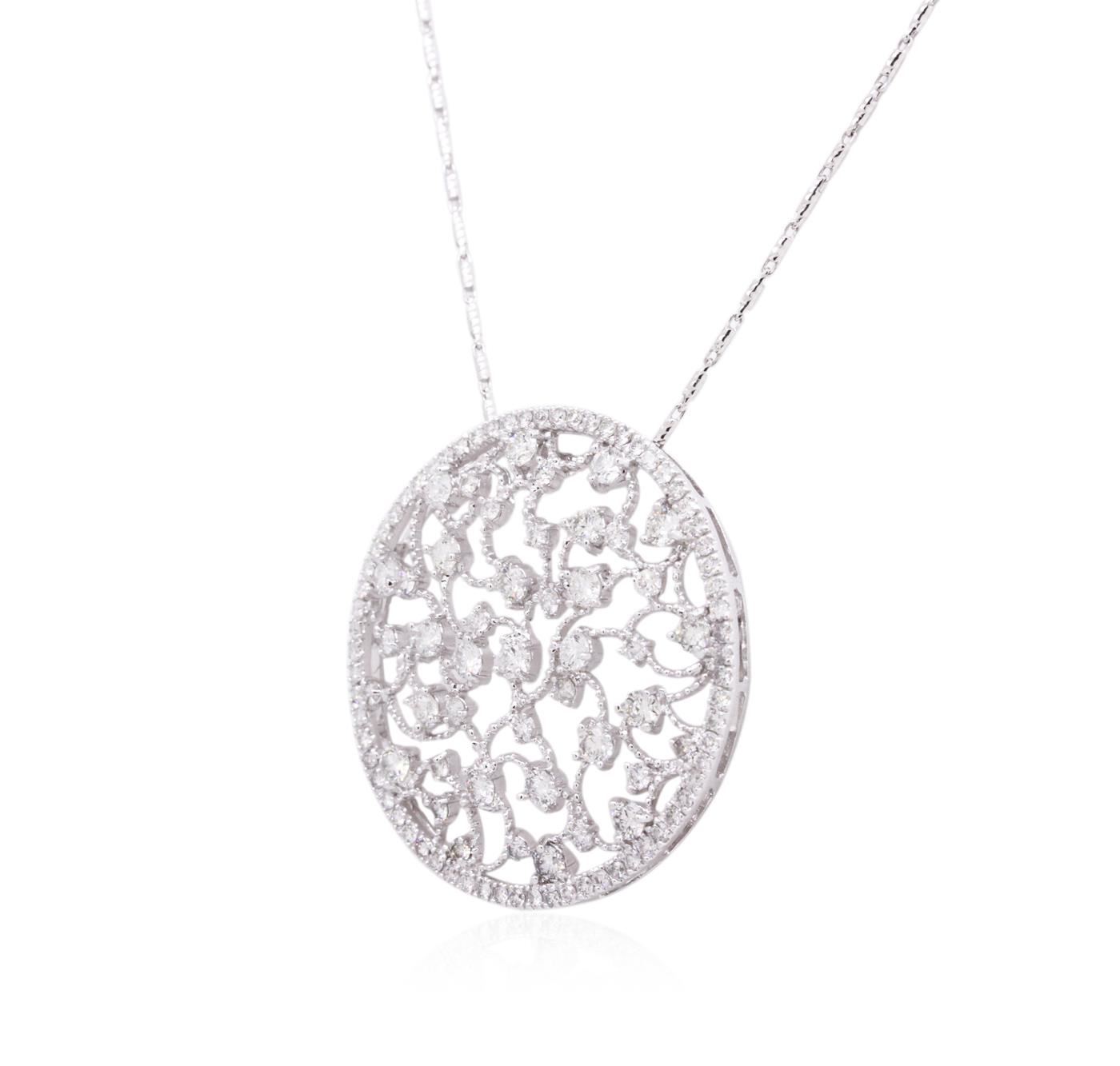 One electronically tested 14KT white gold ladies combination cast & assembled diamond pendant & chain 18.0" long, cable link with a lobster claw clasp with a bright polish finish. Identified with markings of "585". Condition is new. Containing: Thirty-Three prong set round brilliant cut diamonds, measuring 2.50 - 1.50 x 1.20mm (depth est.) approximate total weight of 33 Stones = 0.96ct. Clarity: SI-1 to I-1. Color: I - J, Cut is Good. Sixty prong set round brilliant cut diamonds, measuring 1.10 - 1.10 x 0.66mm (depth est.) approximate total weight of 60 Stones = 0.29ct. Clarity: SI-2 to I-1. Color: I - J, Cut is Good. All diamonds are graded in the mounting, unless otherwise stated. Total Weight of Diamonds 1.25ct. Total Weight of Pendant & Chain 10.50 grams. GGL Appraised at $7,130.00.