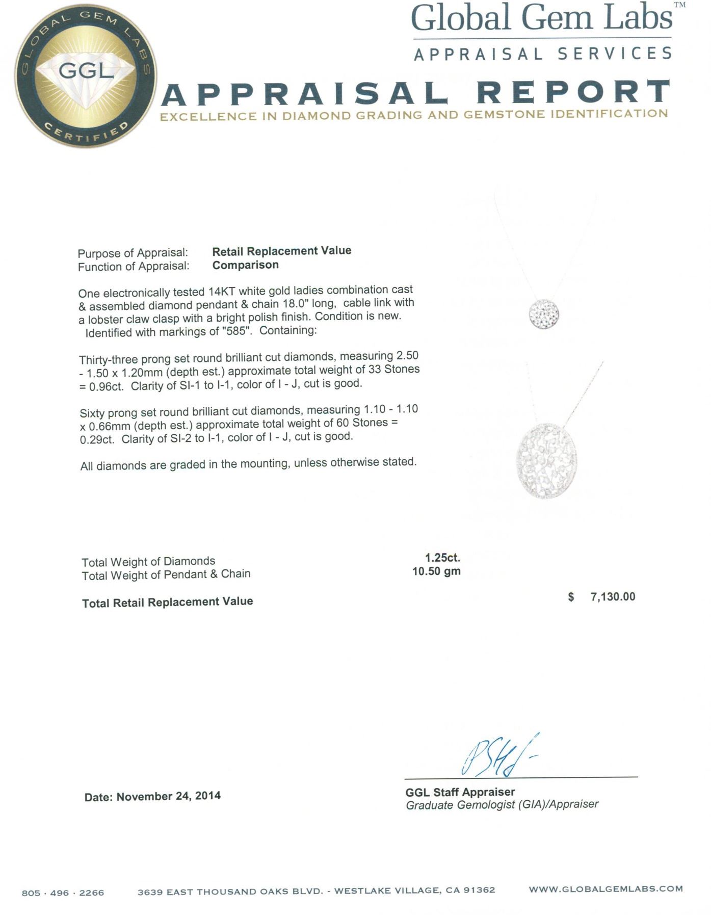 One electronically tested 14KT white gold ladies combination cast & assembled diamond pendant & chain 18.0" long, cable link with a lobster claw clasp with a bright polish finish. Identified with markings of "585". Condition is new. Containing: Thirty-Three prong set round brilliant cut diamonds, measuring 2.50 - 1.50 x 1.20mm (depth est.) approximate total weight of 33 Stones = 0.96ct. Clarity: SI-1 to I-1. Color: I - J, Cut is Good. Sixty prong set round brilliant cut diamonds, measuring 1.10 - 1.10 x 0.66mm (depth est.) approximate total weight of 60 Stones = 0.29ct. Clarity: SI-2 to I-1. Color: I - J, Cut is Good. All diamonds are graded in the mounting, unless otherwise stated. Total Weight of Diamonds 1.25ct. Total Weight of Pendant & Chain 10.50 grams. GGL Appraised.