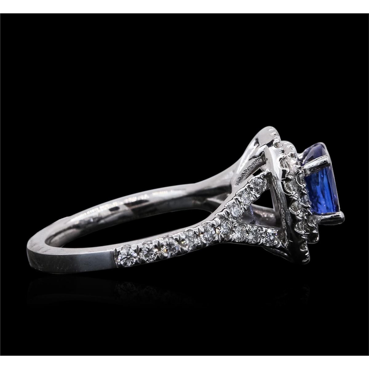 One electronically tested 14KT white gold ladies cast tanzanite & diamond ring with a bright finish. The featured tanzanite is set within a tiered diamond bezel, supported by diamond set shoulders, completed by a two millimeter wide band. Identified with markings of "14K". Condition is new, good workmanship. Containing: One prong set square cushion brilliant cut natural tanzanite, measuring 6.50 x 6.40 x 3.82mm, approximate weight of 1.25ct., clarity is slightly included, type I, medium dark, very slightly grayish, violetish blue color, (GIA vB 6/3), cut is good. Transmitting light with no distortion, transparent. Graded in the setting. Tanzanite is a very rare gemstone that is only found in the country of Tanzania. Originally discovered in 1967. Tiffany & Company, named the stone Tanzanite. It is found in the Usumburu Mountains that border the Umba Valley of northern Tanzania. Tanzanite occurs in gray, brown, violet, blue, reddish-purple, & green. The gem is interesting because of its exceptional pleochroism. Rotated in different directions a tanzanite will exhibit multiple changes of color. Tanzanite has a low tolerance to ultrasonic cleaning, and should not be cleaned using this method. Fifty-Eight prong set round brilliant cut diamonds, measuring 1.60 - 1.40 x 0.90mm (depth est.) approximate total weight of 58 Stones = 0.74ct. Graded in the setting. Clarity: SI-2 to I-1. Color: H - J. Total Weight of Colored Stones 1.25ct. Total Weight of Diamonds 0.74ct. Total Weight of Ring 5.07 grams. AIG Appraised at $5,430.00.