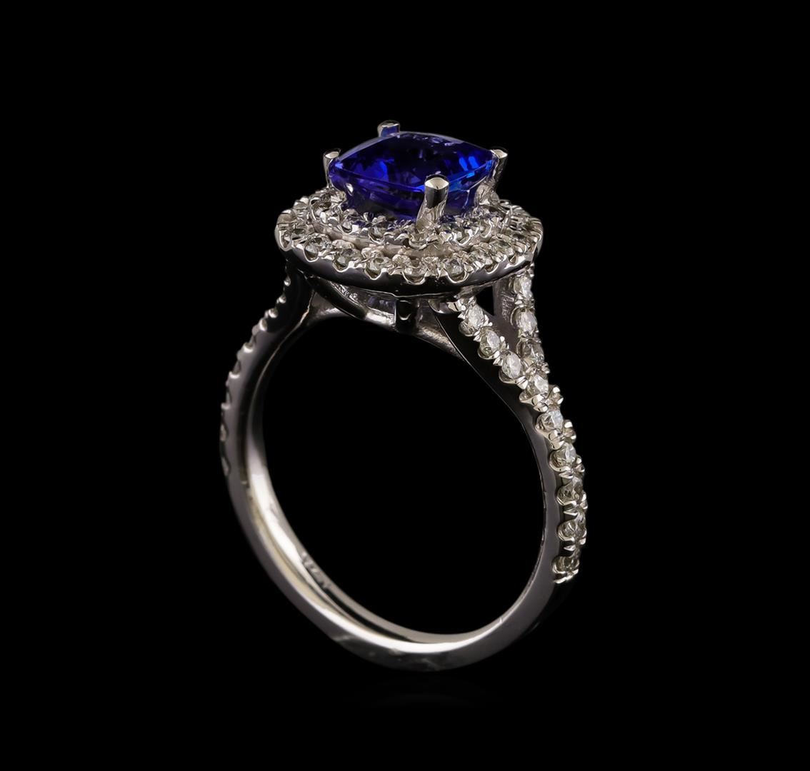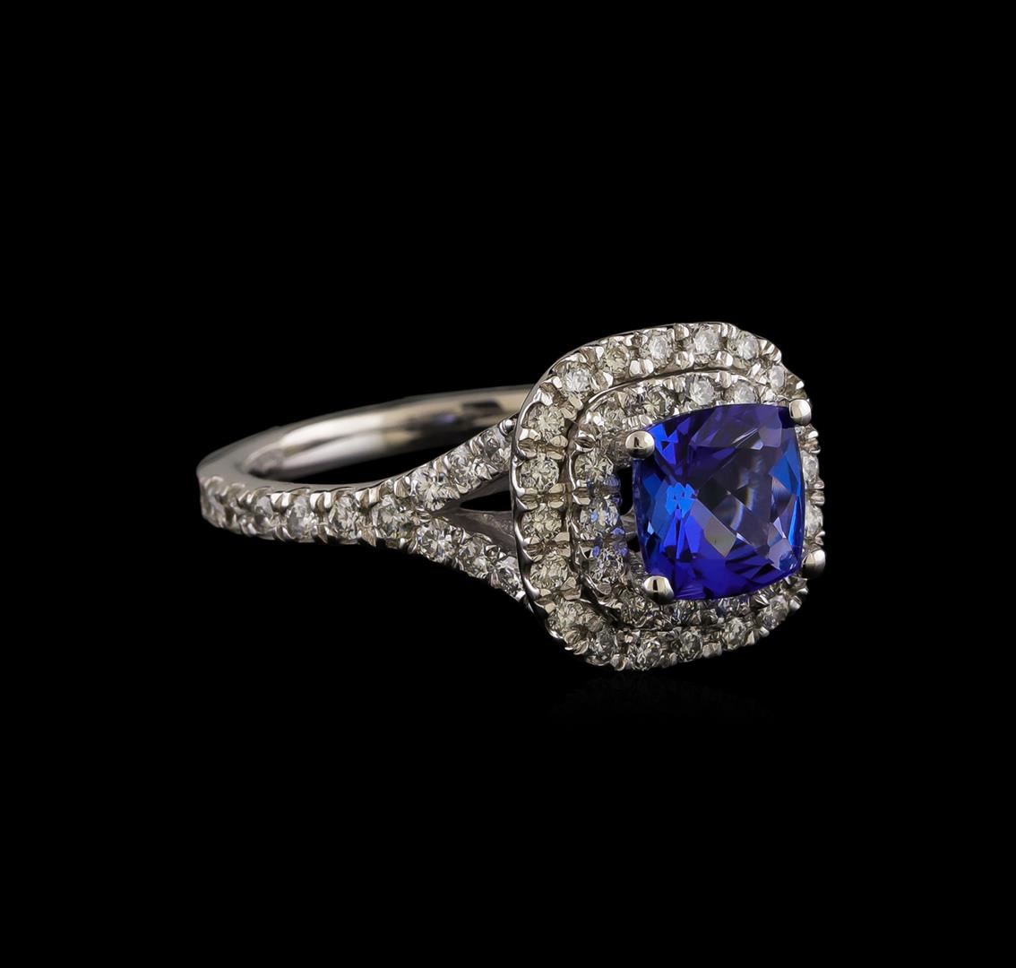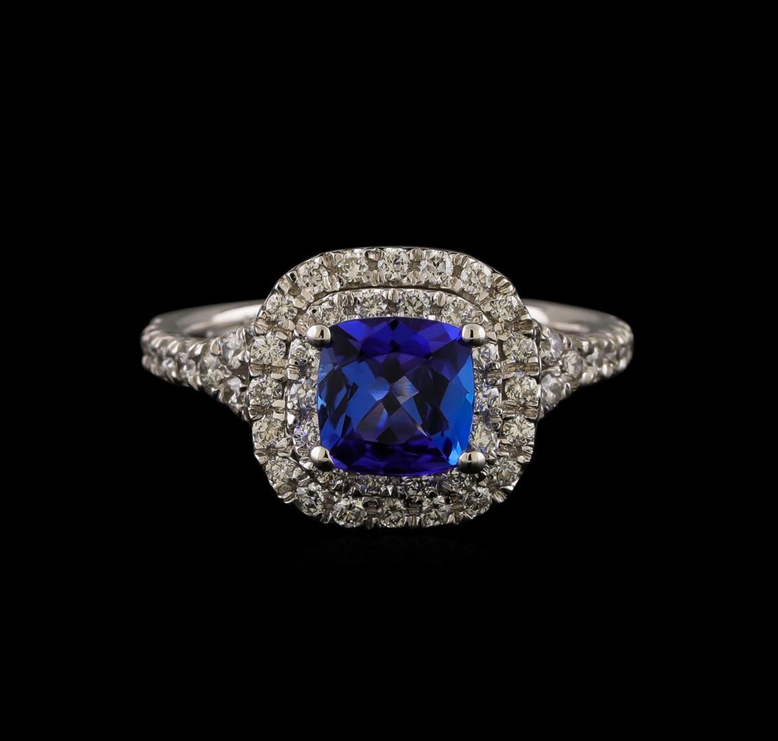 One electronically tested 14KT white gold ladies cast tanzanite & diamond ring with a bright finish. The featured tanzanite is set within a tiered diamond bezel, supported by diamond set shoulders, completed by a two millimeter wide band. Identified with markings of "14K". Condition is new, good workmanship. Containing: One prong set square cushion brilliant cut natural tanzanite, measuring 6.50 x 6.40 x 3.82mm, approximate weight of 1.25ct., clarity is slightly included, type I, medium dark, very slightly grayish, violetish blue color, (GIA vB 6/3), cut is good. Transmitting light with no distortion, transparent. Graded in the setting. Tanzanite is a very rare gemstone that is only found in the country of Tanzania. Originally discovered in 1967. Tiffany & Company, named the stone Tanzanite. It is found in the Usumburu Mountains that border the Umba Valley of northern Tanzania. Tanzanite occurs in gray, brown, violet, blue, reddish-purple, & green. The gem is interesting because of its exceptional pleochroism. Rotated in different directions a tanzanite will exhibit multiple changes of color. Tanzanite has a low tolerance to ultrasonic cleaning, and should not be cleaned using this method. Fifty-Eight prong set round brilliant cut diamonds, measuring 1.60 - 1.40 x 0.90mm (depth est.) approximate total weight of 58 Stones = 0.74ct. Graded in the setting. Clarity: SI-2 to I-1. Color: H - J. Total Weight of Colored Stones 1.25ct. Total Weight of Diamonds 0.74ct. Total Weight of Ring 5.07 grams. AIG Appraised at $5,430.00.