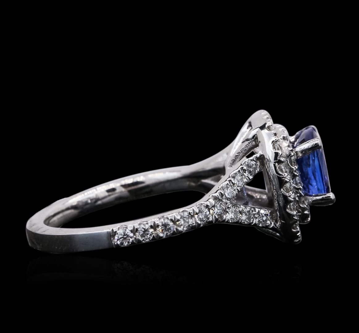 One electronically tested 14KT white gold ladies cast tanzanite & diamond ring with a bright finish. The featured tanzanite is set within a tiered diamond bezel, supported by diamond set shoulders, completed by a two millimeter wide band. Identified with markings of "14K". Condition is new, good workmanship. Containing: One prong set square cushion brilliant cut natural tanzanite, measuring 6.50 x 6.40 x 3.82mm, approximate weight of 1.25ct., clarity is slightly included, type I, medium dark, very slightly grayish, violetish blue color, (GIA vB 6/3), cut is good. Transmitting light with no distortion, transparent. Graded in the setting. Tanzanite is a very rare gemstone that is only found in the country of Tanzania. Originally discovered in 1967. Tiffany & Company, named the stone Tanzanite. It is found in the Usumburu Mountains that border the Umba Valley of northern Tanzania. Tanzanite occurs in gray, brown, violet, blue, reddish-purple, & green. The gem is interesting because of its exceptional pleochroism. Rotated in different directions a tanzanite will exhibit multiple changes of color. Tanzanite has a low tolerance to ultrasonic cleaning, and should not be cleaned using this method. Fifty-Eight prong set round brilliant cut diamonds, measuring 1.60 - 1.40 x 0.90mm (depth est.) approximate total weight of 58 Stones = 0.74ct. Graded in the setting. Clarity: SI-2 to I-1. Color: H - J. Total Weight of Colored Stones 1.25ct. Total Weight of Diamonds 0.74ct. Total Weight of Ring 5.07 grams. AIG Appraised at $5,430.00.