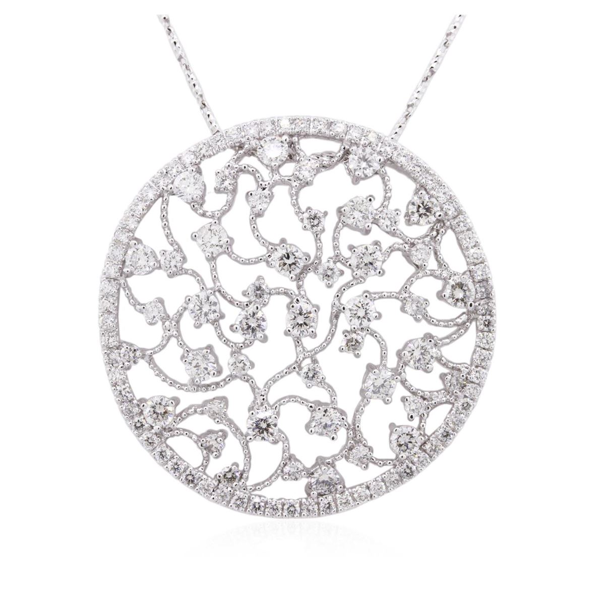 One electronically tested 14KT white gold ladies combination cast & assembled diamond pendant & chain 18.0" long, cable link with a lobster claw clasp with a bright polish finish. Identified with markings of "585". Condition is new. Containing: Thirty-Three prong set round brilliant cut diamonds, measuring 2.50 - 1.50 x 1.20mm (depth est.) approximate total weight of 33 Stones = 0.96ct. Clarity: SI-1 to I-1. Color: I - J, Cut is Good. Sixty prong set round brilliant cut diamonds, measuring 1.10 - 1.10 x 0.66mm (depth est.) approximate total weight of 60 Stones = 0.29ct. Clarity: SI-2 to I-1. Color: I - J, Cut is Good. All diamonds are graded in the mounting, unless otherwise stated. Total Weight of Diamonds 1.25ct. Total Weight of Pendant & Chain 10.50 grams. GGL Appraised at $7,130.00.