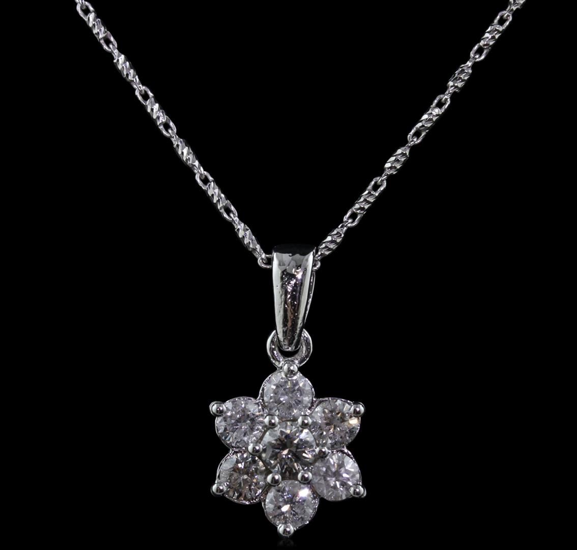 One electronically tested 14KT white gold ladies combination cast & assembled diamond pendant & chain 18.0" long, medium fancy link with a lobster claw clasp with a bright polish finish. Identified with markings of "14K". Condition is new. Containing: Seven prong set round brilliant cut diamonds, measuring 3.80 - 3.50 x 2.19mm (depth est.) approximate total weight of 7 Stones = 1.25ct. Clarity: SI-2 to I-2. Color: I - J, Cut is Good. All diamonds are graded in the mounting, unless otherwise stated. Total Weight of Diamonds 1.25ct. Total Weight of Pendant & Chain 5.90 grams. GGL Appraised at $4,800.00.