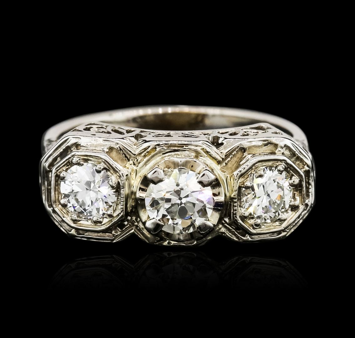 One electronically tested 14KT white gold ladies cast diamond ring with a bright polish finish. The ring features a diamond trio supported by an elaborate lattice under gallery, completed by a one and one-half millimeter wide band. The ring is reminiscent of the jewelry designs from the Edwardian Period. Lace translated into diamonds. This is the phrase used to describe Edwardian jewelry. The Edwardian Period was a short period, dating from 1901 to 1910, during the reign of King Edward VIII, son of Queen Victoria It had its roots in the final years of the Victorian period. Diamonds were made to look as fine and delicate as possible. Princess Alexandra, Edward's wife, and the Princess of Wales had a great influence on the jewelry of the period. Edwardian jewelry was the first to reflect a dramatic progress made in gem stone cutting. Condition is good. Containing: One prong set Old European cut diamond, measuring 5.26 - 5.25 x 3.00mm (depth est.) approximate weight of 0.60ct with a faint blue fluorescence. Cutting style circa early 20th century. Graded in the setting. Clarity: SI-1. Color: I Two prong set round brilliant cut diamonds, measuring 4.30 - 4.20 x 2.50mm (depth est.) approximate total weight of 2 Stones = 0.65ct. Graded in the setting. Clarity: VS-2 to SI-1. Color: H - I. Total Weight of Diamonds 1.25ct. Total Weight of Ring 3.92 grams. AIG Appraised at $7,545.00.