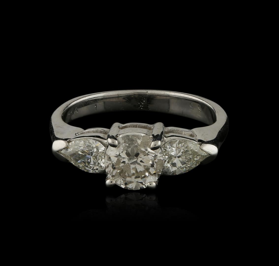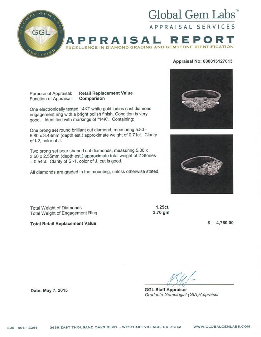One electronically tested 14KT white gold ladies cast diamond engagement ring with a bright polish finish. Identified with markings of "14K". Condition is very good. Containing: One prong set round brilliant cut diamond, measuring 5.80 - 5.80 x 3.48mm (depth est.) approximate weight of 0.71ct. Clarity: I-2. Color: J. Two prong set pear shaped cut diamonds, measuring 5.00 x 3.50 x 2.55mm (depth est.) approximate total weight of 2 Stones = 0.54ct. Clarity: SI-1. Color: J, Cut is Good. All diamonds are graded in the mounting, unless otherwise stated. Total Weight of Diamonds 1.25ct. Total Weight of Engagement Ring 3.70 grams. GGL Appraised at $4,760.00.