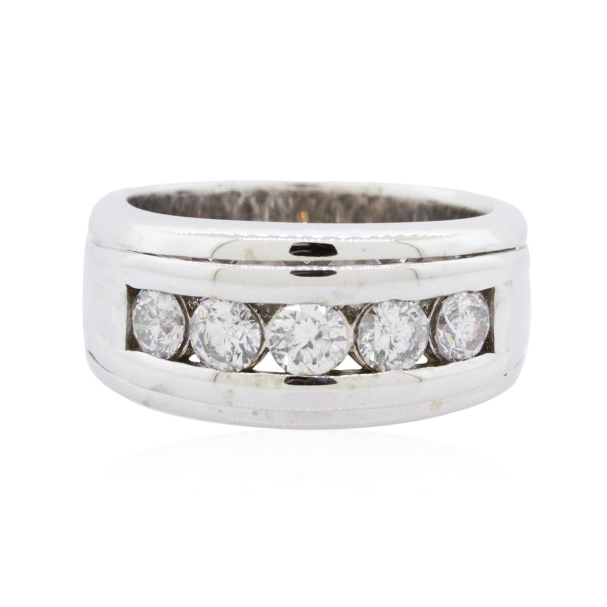 One electronically tested 14KT white gold mens combination cast & assembled diamond ring with a bright polish finish. Identified with markings of "14K". Condition is new. Containing: Five channel set round brilliant cut diamonds, measuring 4.10 - 4.10 x 2.46mm (depth est.) approximate total weight of 5 Stones = 1.26ct. Clarity: I-1. Color: J, Cut is Good. All diamonds are graded in the mounting, unless otherwise stated. Total Weight of Diamonds 1.26ct. Total Weight of Ring 14.00 grams. GGL Appraised at $6,150.00.