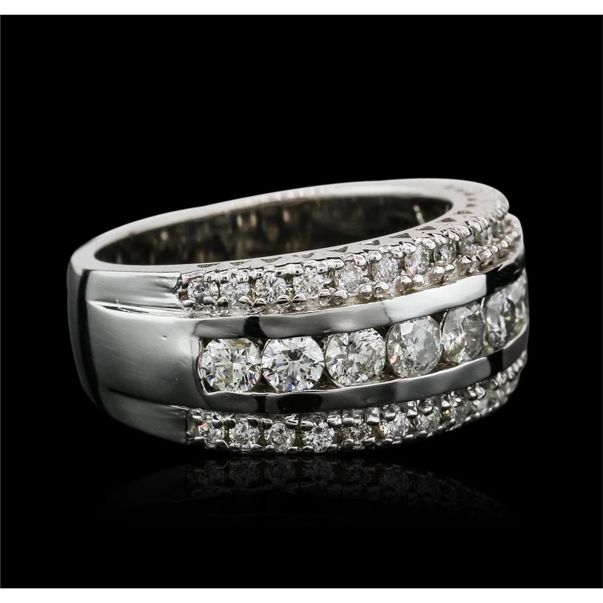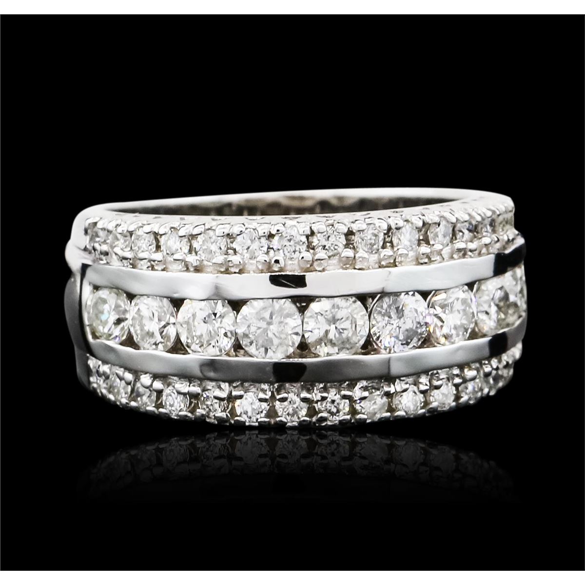 One electronically tested 14KT white gold ladies combination cast & assembled diamond ring with a bright polish finish. Identified with markings of "14K". Condition is new. Containing: Nine channel set round brilliant cut diamonds, measuring 3.00 - 3.00 x 1.80mm (depth est.) approximate total weight of 9 Stones = 0.89ct. Clarity: I-1 to I-2. Color: H - I, Cut is Good. Thirty prong set round brilliant cut diamonds, measuring 1.50 - 1.50 x 0.90mm (depth est.) approximate total weight of 30 Stones = 0.37ct. Clarity: SI-2 to I-1. Color: I - J, Cut is Good. All diamonds are graded in the mounting, unless otherwise stated. Total Weight of Diamonds 1.26ct. Total Weight of Ring 9.10 grams. GGL Appraised at $4,955.00.