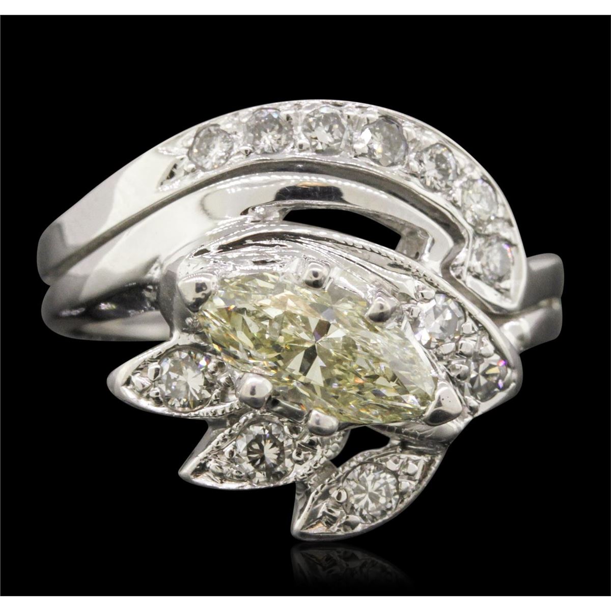 One electronically tested 14KT white gold ladies combination cast & assembled engagement ring with a bright polish finish. Condition is very good. Identified with markings of "14K". Containing: One prong set marquise shaped cut diamond, measuring 10.00 x 5.00 x 3.15mm (depth est.) approximate weight of 0.91ct. Clarity: SI-1, Cut is Good. Two prong set single cut diamonds, measuring 2.00 - 2.00 x 1.20mm (depth est.) approximate. Total Weight of 2 Stones = 0.06ct. Clarity: VS-2. Color: H, Cut is Good. Ten prong set round brilliant cut diamonds, measuring 2.00 - 2.00 x 1.20mm (depth est.) approximate. Total Weight of 10 Stones = 0.29ct. Clarity: SI-1 to SI-2. Color: I - J, Cut is Good. All diamonds are graded in the mounting, unless otherwise stated. Total Weight of Diamonds 1.26ct. Total Weight of Ring 6.80 grams. GGL Appraised at $8,455.00.