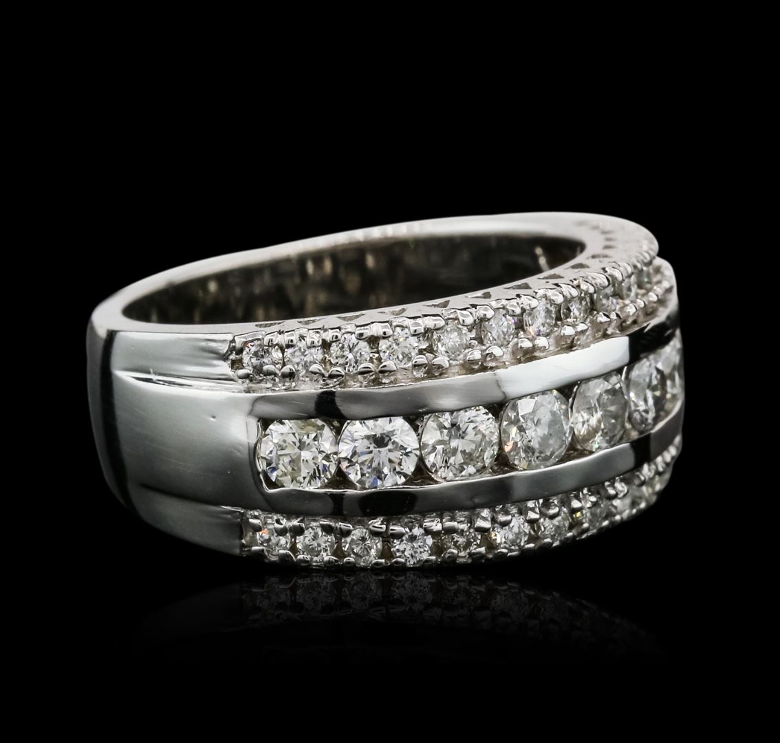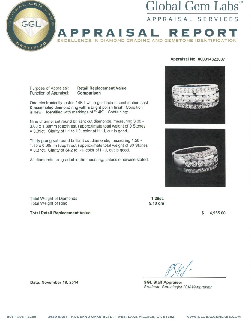 One electronically tested 14KT white gold ladies combination cast & assembled diamond ring with a bright polish finish. Identified with markings of "14K". Condition is new. Containing: Nine channel set round brilliant cut diamonds, measuring 3.00 - 3.00 x 1.80mm (depth est.) approximate total weight of 9 Stones = 0.89ct. Clarity: I-1 to I-2. Color: H - I, Cut is Good. Thirty prong set round brilliant cut diamonds, measuring 1.50 - 1.50 x 0.90mm (depth est.) approximate total weight of 30 Stones = 0.37ct. Clarity: SI-2 to I-1. Color: I - J, Cut is Good. All diamonds are graded in the mounting, unless otherwise stated. Total Weight of Diamonds 1.26ct. Total Weight of Ring 9.10 grams. GGL Appraised at $4,955.00.