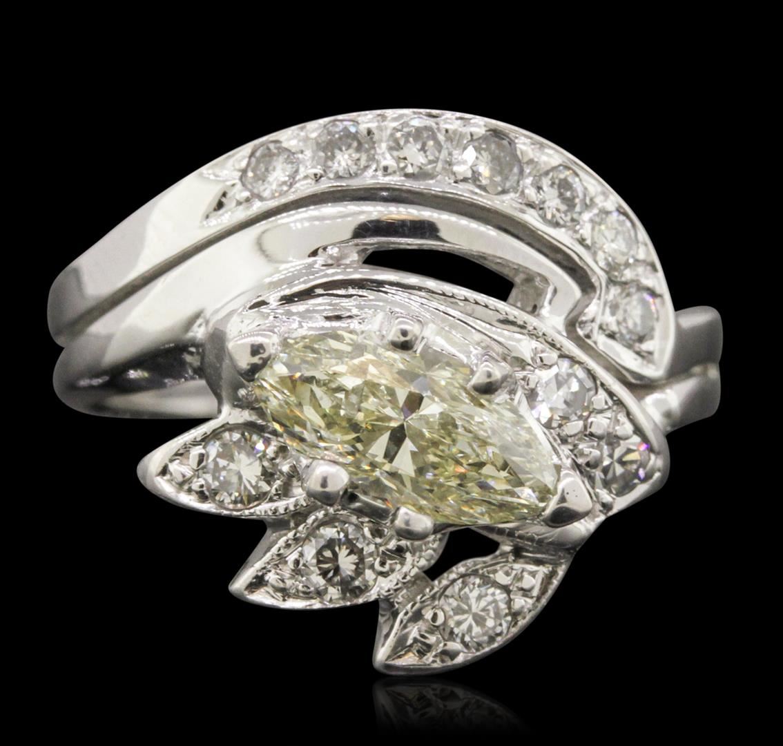 One electronically tested 14KT white gold ladies combination cast & assembled engagement ring with a bright polish finish. Condition is very good. Identified with markings of "14K". Containing: One prong set marquise shaped cut diamond, measuring 10.00 x 5.00 x 3.15mm (depth est.) approximate weight of 0.91ct. Clarity: SI-1, Cut is Good. Two prong set single cut diamonds, measuring 2.00 - 2.00 x 1.20mm (depth est.) approximate. Total Weight of 2 Stones = 0.06ct. Clarity: VS-2. Color: H, Cut is Good. Ten prong set round brilliant cut diamonds, measuring 2.00 - 2.00 x 1.20mm (depth est.) approximate. Total Weight of 10 Stones = 0.29ct. Clarity: SI-1 to SI-2. Color: I - J, Cut is Good. All diamonds are graded in the mounting, unless otherwise stated. Total Weight of Diamonds 1.26ct. Total Weight of Ring 6.80 grams. GGL Appraised at $8,455.00.