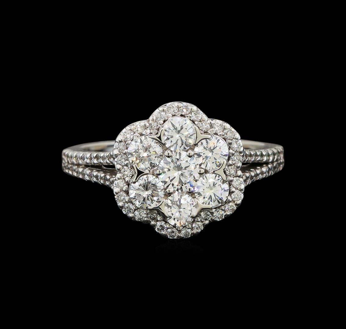 One electronically tested 14KT white gold ladies cast diamond ring with a bright polish finish. Identified with markings of "14K". Condition is new. Containing: One prong set round brilliant cut diamond, measuring 4.00 - 4.00 x 2.40mm (depth est.) approximate weight of 0.23ct. Clarity: SI-2. Color: I, Cut is Good. Seventy-One prong set round brilliant cut diamonds, measuring 2.80 - 1.10 x 1.17mm (depth est.) approximate total weight of 71 Stones = 1.04ct. Clarity: SI-1 to I-1. Color: I - J, Cut is Good. All diamonds are graded in the mounting, unless otherwise stated. Total Weight of Diamonds 1.27ct. Total Weight of Ring 4.50 grams. GGL Appraised at $3,450.00.