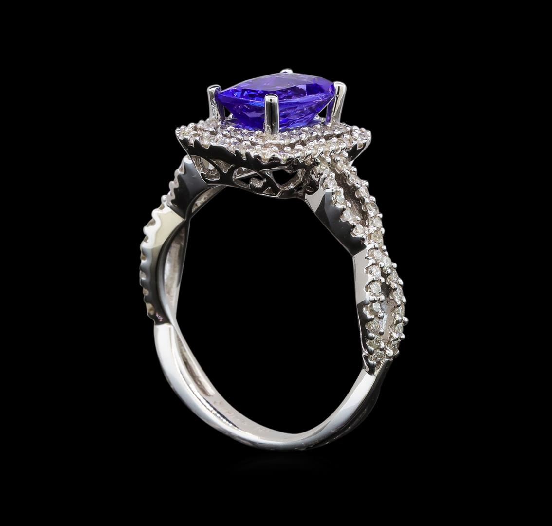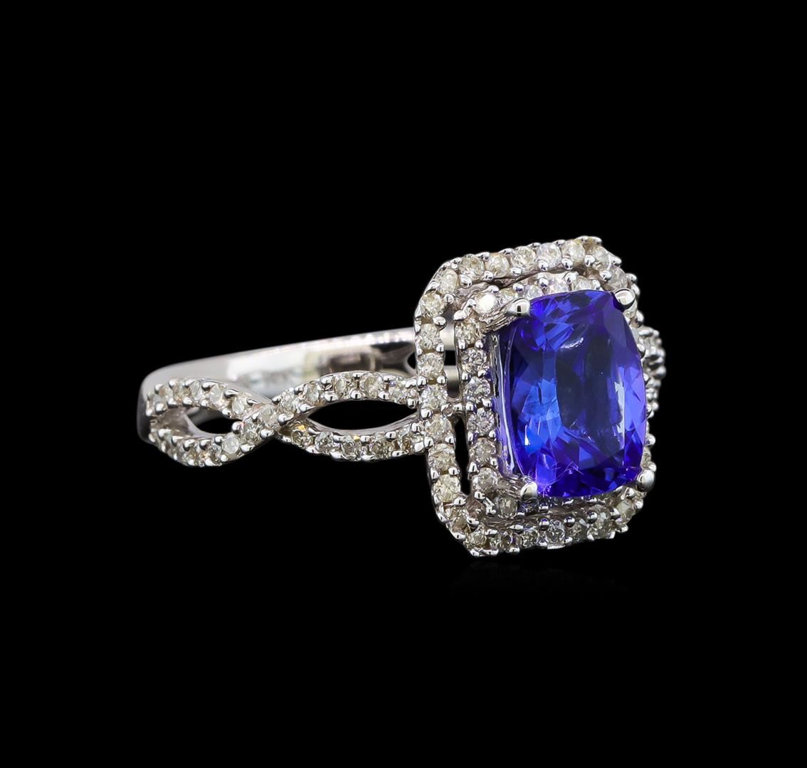 One electronically tested 14KT white gold ladies cast tanzanite and diamond ring with a half round shank with a bright polish finish. Trademark is Orianne. Identified with markings of "14K". Condition is new. Containing: One prong set rectangular cushion modified brilliant cut natural tanzanite, measuring 8.06 x 6.15 x 3.26mm, approximate weight of 1.27ct., clarity is eye clean, type I, medium light, very slightly grayish, violet color, (GIA V 4/3), cut is good. Ninety-Nine prong set round brilliant cut diamonds, measuring 1.00 - 1.00 x 0.60mm (depth est.) approximate total weight of 99 Stones = 0.36ct. Clarity: I-1 to I-2. Color: I - J. All diamonds and colored gemstones are graded in the mounting, unless otherwise stated. Colored gemstones are presumed to have been subjected to commonly used enhancement processes. Total Weight of Colored Stones 1.27ct. Total Weight of Diamonds 0.36ct. Total Weight of Ring 3.80 grams. GGL Appraised at $3,150.00.