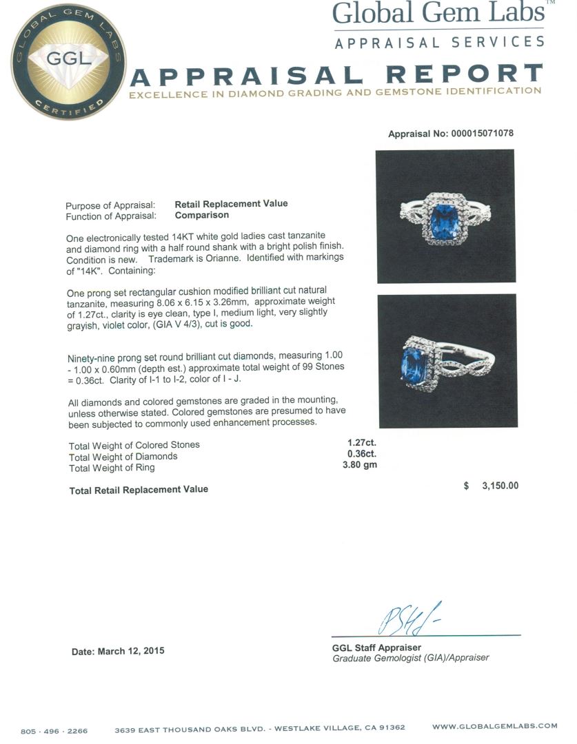 One electronically tested 14KT white gold ladies cast tanzanite and diamond ring with a half round shank with a bright polish finish. Trademark is Orianne. Identified with markings of "14K". Condition is new. Containing: One prong set rectangular cushion modified brilliant cut natural tanzanite, measuring 8.06 x 6.15 x 3.26mm, approximate weight of 1.27ct., clarity is eye clean, type I, medium light, very slightly grayish, violet color, (GIA V 4/3), cut is good. Ninety-Nine prong set round brilliant cut diamonds, measuring 1.00 - 1.00 x 0.60mm (depth est.) approximate total weight of 99 Stones = 0.36ct. Clarity: I-1 to I-2. Color: I - J. All diamonds and colored gemstones are graded in the mounting, unless otherwise stated. Colored gemstones are presumed to have been subjected to commonly used enhancement processes. Total Weight of Colored Stones 1.27ct. Total Weight of Diamonds 0.36ct. Total Weight of Ring 3.80 grams. GGL Appraised at $3,150.00.