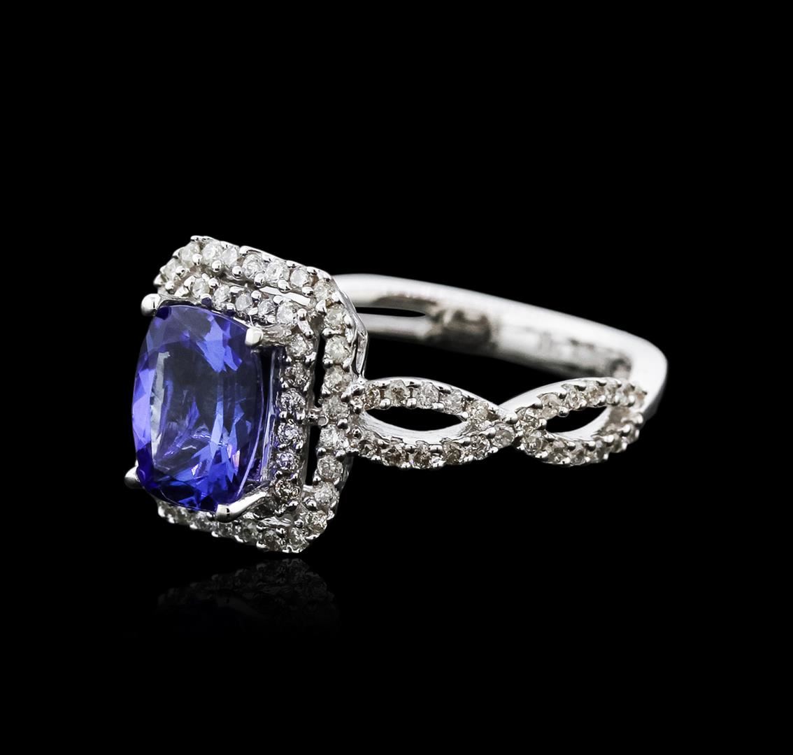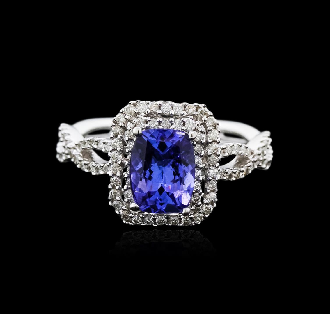 One electronically tested 14KT white gold ladies cast tanzanite and diamond ring with a half round shank with a bright polish finish. Trademark is Orianne. Identified with markings of "14K". Condition is new. Containing: One prong set rectangular cushion modified brilliant cut natural tanzanite, measuring 8.06 x 6.15 x 3.26mm, approximate weight of 1.27ct., clarity is eye clean, type I, medium light, very slightly grayish, violet color, (GIA V 4/3), cut is good. Ninety-Nine prong set round brilliant cut diamonds, measuring 1.00 - 1.00 x 0.60mm (depth est.) approximate total weight of 99 Stones = 0.36ct. Clarity: I-1 to I-2. Color: I - J. All diamonds and colored gemstones are graded in the mounting, unless otherwise stated. Colored gemstones are presumed to have been subjected to commonly used enhancement processes. Total Weight of Colored Stones 1.27ct. Total Weight of Diamonds 0.36ct. Total Weight of Ring 3.80 grams. GGL Appraised at $3,150.00.