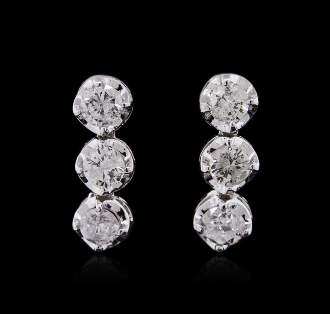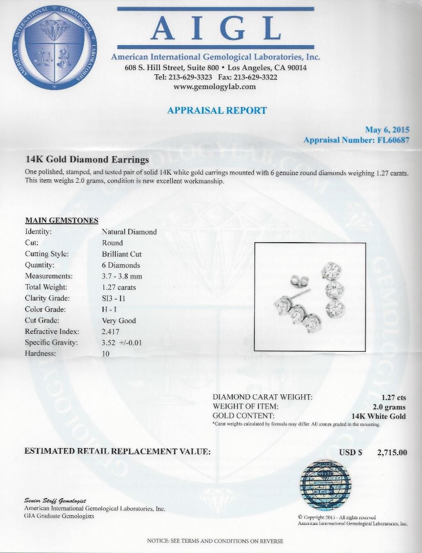 One polished, stamped, and tested pair of solid 14K white gold earrings mounted with 6 genuine diamonds weighing 1.27 carats. This item weighs 2.0 grams, condition is new, excellent workmanship. MAIN GEMSTONES: Identity: Natural Diamond. Cut: Round. Cutting Style: Brilliant Cut. Quantity: 6 Diamonds. Measurements: 3.7 - 3.8 mm. Total Weight: 1.27 carats. Clarity Grade: SI3 - I1. Color Grade: H - I. Cut Grade: Very Good. Refractive Index: 2.417. Specific Gravity: 3.52 +/-0.01. Hardness: 10. Total Diamond Weight: 1.27 cts. Weight of Item: 2.0 grams. Gold Content: 14K White Gold. AIGL Appraised at $2,715.00.