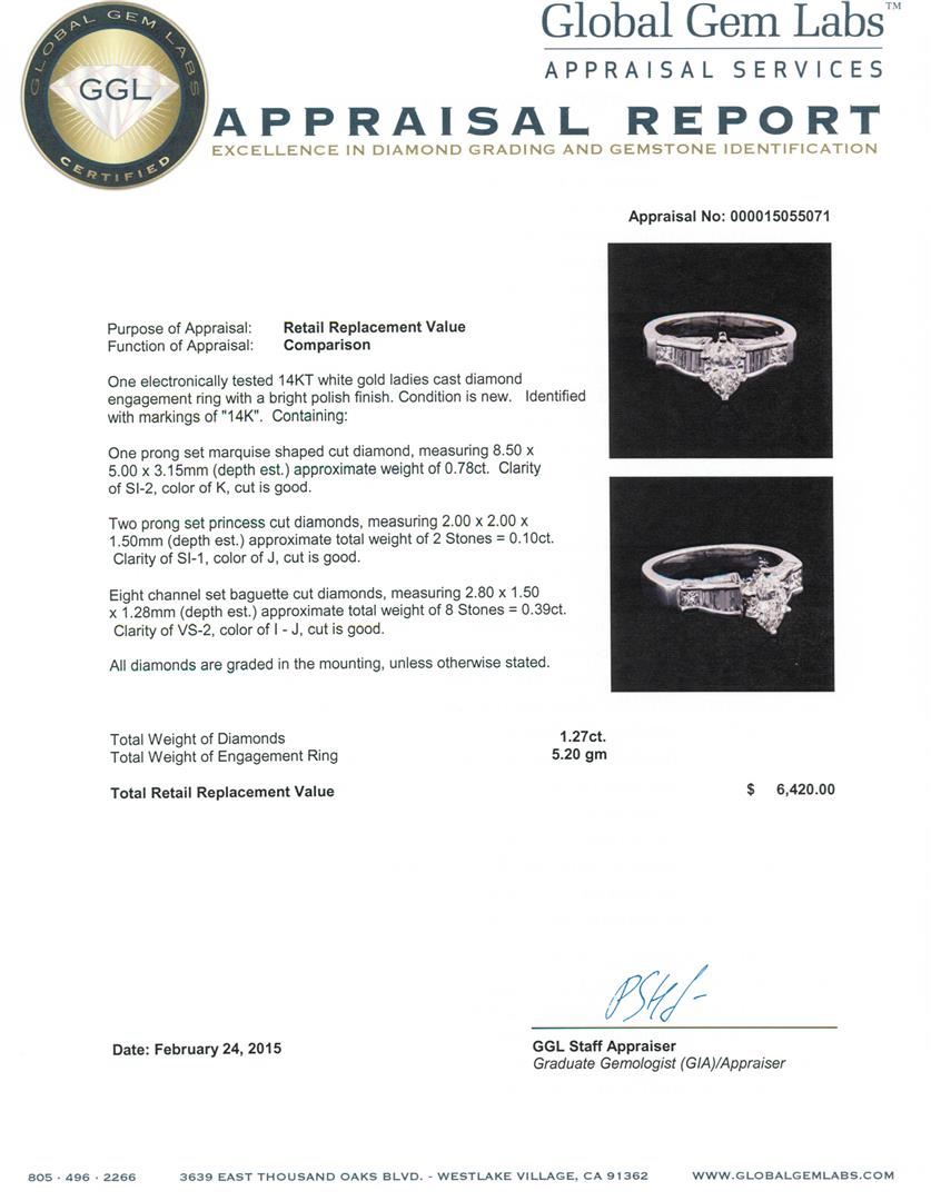 One electronically tested 14KT white gold ladies cast diamond engagement ring with a bright polish finish. Identified with markings of "14K". Condition is new. Containing: One prong set marquise shaped cut diamond, measuring 8.50 x 5.00 x 3.15mm (depth est.) approximate weight of 0.78ct. Clarity: SI-2. Color: K, Cut is Good. Two prong set princess cut diamonds, measuring 2.00 x 2.00 x 1.50mm (depth est.) approximate total weight of 2 Stones = 0.10ct. Clarity: SI-1. Color: J, Cut is Good. Eight channel set baguette cut diamonds, measuring 2.80 x 1.50 x 1.28mm (depth est.) approximate total weight of 8 Stones = 0.39ct. Clarity: VS-2. Color: I - J, Cut is Good. All diamonds are graded in the mounting, unless otherwise stated. Total Weight of Diamonds 1.27ct. Total Weight of Engagement Ring 5.20 grams. GGL Appraised at $6,420.00.