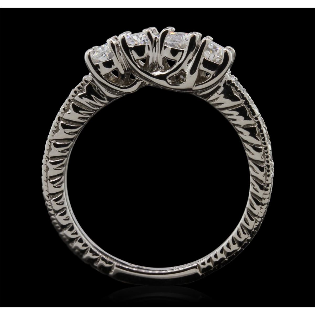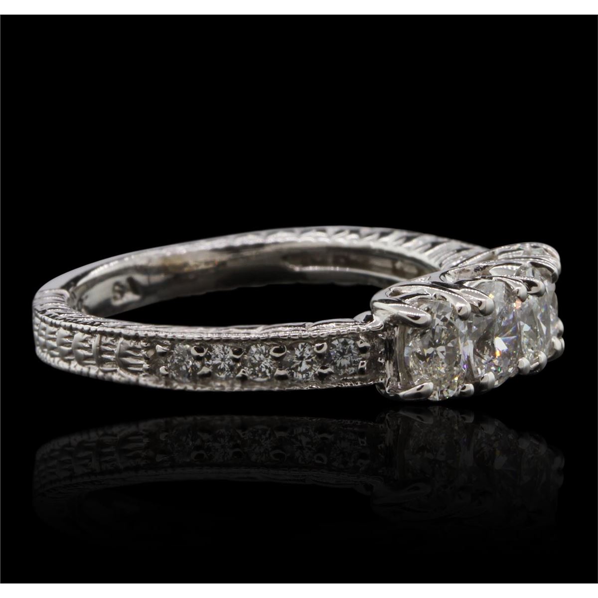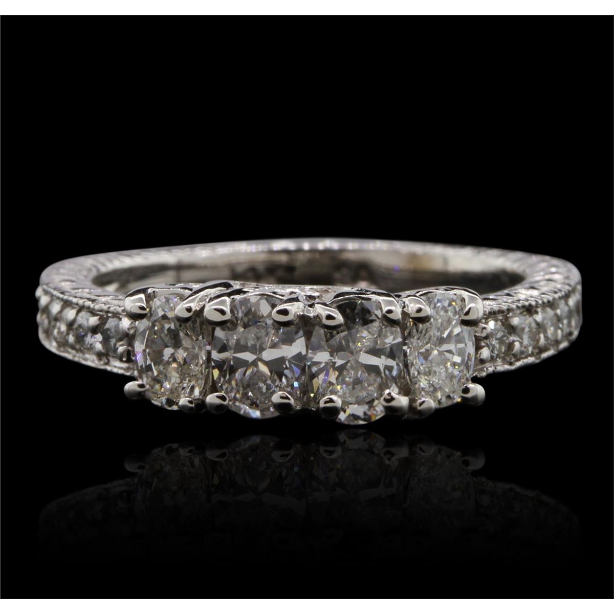 One electronically tested 14KT White Gold ladies cast diamond ring. Condition is new, good workmanship. The ring features a series of four oval shaped diamonds supported by round brilliant diamond set shoulders, completed by a patterned two and one-half millimeter wide band. Bright polish finish with milgrain detailing throughout. Identified with markings of "14K". Containing: Two prong set oval shaped cut diamonds, measuring 4.80 x 3.80 x 2.39mm (depth est.) approximate. Total Weight of 2 Stones = 0.56ct. Graded in the setting. Clarity: VS-2 to SI-2. Color: H - I. Two prong set oval shaped cut diamonds, measuring 4.50 x 3.30 x 2.08mm (depth est.) approximate. Total Weight of 2 Stones = 0.42ct. Graded in the setting. Clarity: VS-2 to SI-1. Color: H - I. Ten bead set round brilliant cut diamonds, measuring 1.80 - 1.70 x 1.05mm (depth est.) approximate. Total Weight of 10 Stones = 0.29ct. Graded in the setting. Clarity: SI-1 to SI-2. Color: H - J. Total Weight of Diamonds 1.27ct. Total Weight of Ring 4.75gm. AIG Appraised at $5,785.00.