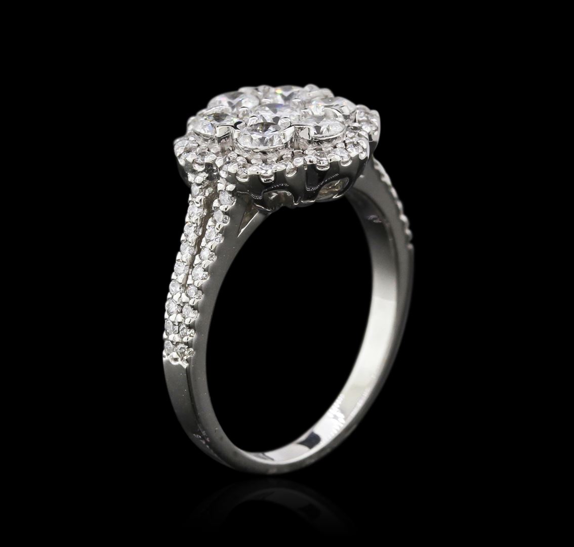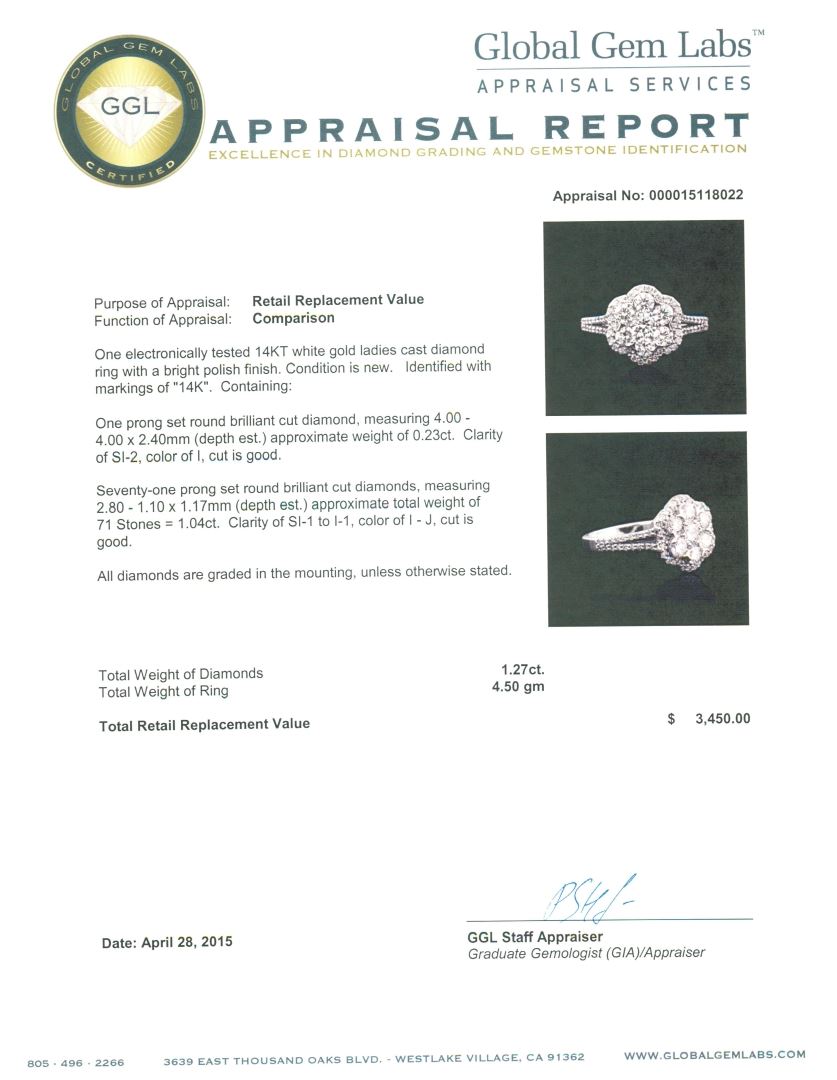 One electronically tested 14KT white gold ladies cast diamond ring with a bright polish finish. Identified with markings of "14K". Condition is new. Containing: One prong set round brilliant cut diamond, measuring 4.00 - 4.00 x 2.40mm (depth est.) approximate weight of 0.23ct. Clarity: SI-2. Color: I, Cut is Good. Seventy-One prong set round brilliant cut diamonds, measuring 2.80 - 1.10 x 1.17mm (depth est.) approximate total weight of 71 Stones = 1.04ct. Clarity: SI-1 to I-1. Color: I - J, Cut is Good. All diamonds are graded in the mounting, unless otherwise stated. Total Weight of Diamonds 1.27ct. Total Weight of Ring 4.50 grams. GGL Appraised at $3,450.00.