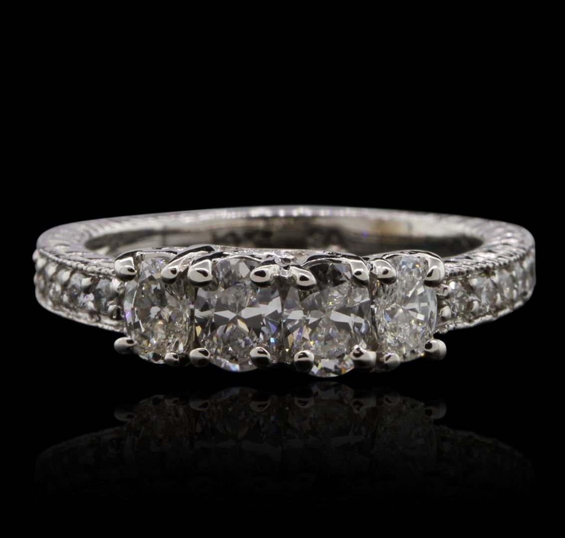 One electronically tested 14KT White Gold ladies cast diamond ring. Condition is new, good workmanship. The ring features a series of four oval shaped diamonds supported by round brilliant diamond set shoulders, completed by a patterned two and one-half millimeter wide band. Bright polish finish with milgrain detailing throughout. Identified with markings of "14K". Containing: Two prong set oval shaped cut diamonds, measuring 4.80 x 3.80 x 2.39mm (depth est.) approximate. Total Weight of 2 Stones = 0.56ct. Graded in the setting. Clarity: VS-2 to SI-2. Color: H - I. Two prong set oval shaped cut diamonds, measuring 4.50 x 3.30 x 2.08mm (depth est.) approximate. Total Weight of 2 Stones = 0.42ct. Graded in the setting. Clarity: VS-2 to SI-1. Color: H - I. Ten bead set round brilliant cut diamonds, measuring 1.80 - 1.70 x 1.05mm (depth est.) approximate. Total Weight of 10 Stones = 0.29ct. Graded in the setting. Clarity: SI-1 to SI-2. Color: H - J. Total Weight of Diamonds 1.27ct. Total Weight of Ring 4.75gm. AIG Appraised at $5,785.00.