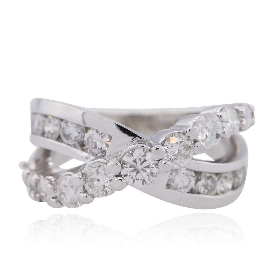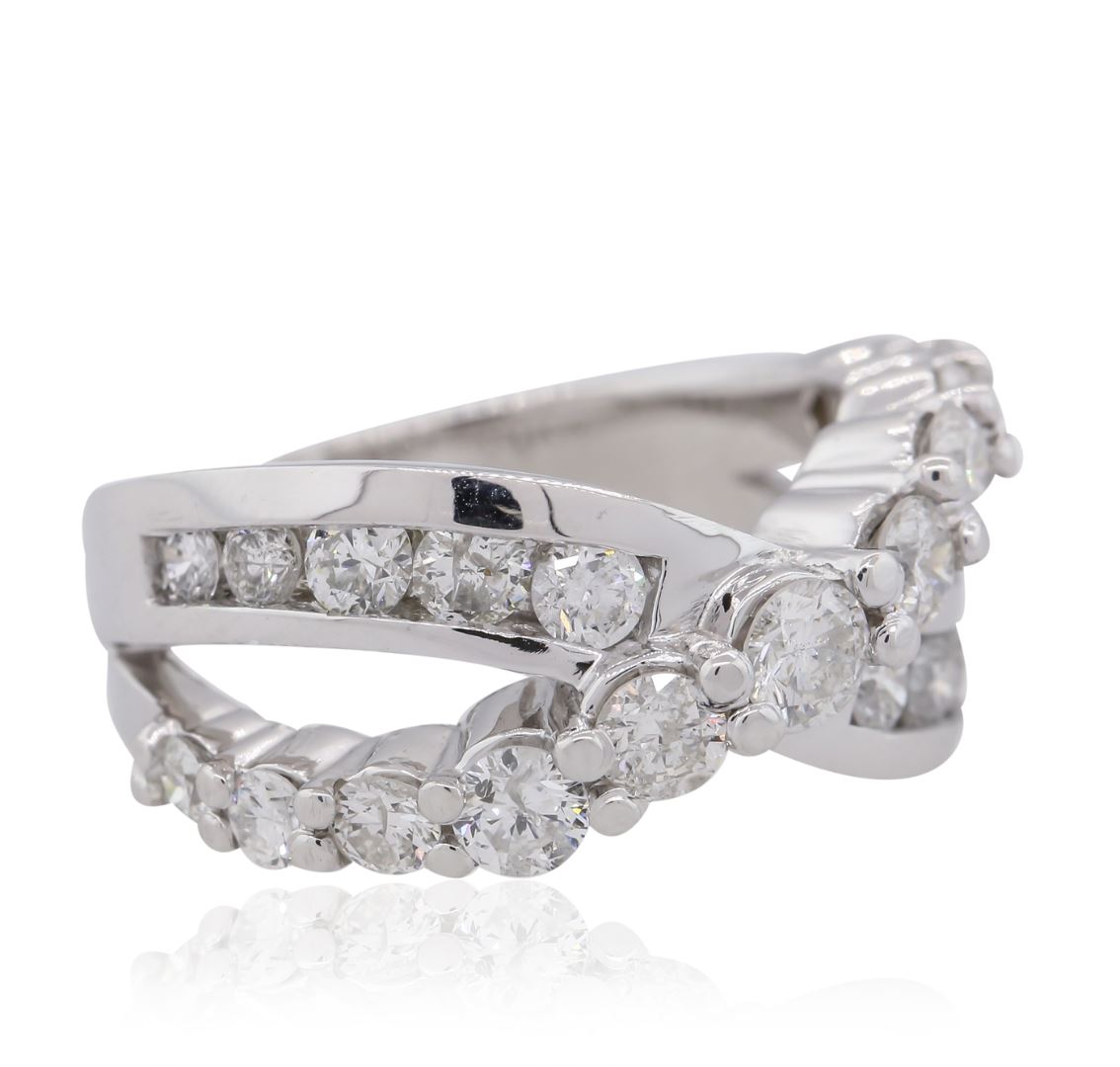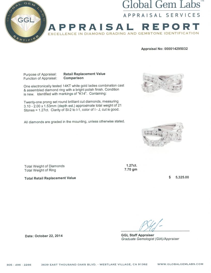 One electronically tested 14KT white gold ladies combination cast & assembled diamond ring with a bright polish finish. Identified with markings of "K14". Condition is new. Containing: Twenty-One prong set round brilliant cut diamonds, measuring 3.10 - 2.00 x 1.53mm (depth est.) approximate total weight of 21 Stones = 1.27ct. Clarity: SI-2 to I-1. Color: I - J, Cut is Good. All diamonds are graded in the mounting, unless otherwise stated. Total Weight of Diamonds 1.27ct. Total Weight of Ring 7.70 grams. GGL Appraised at $5,325.00.