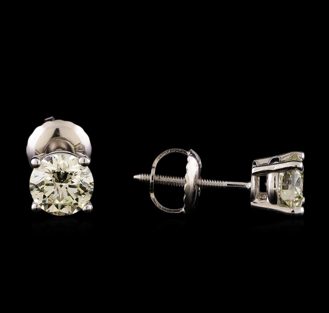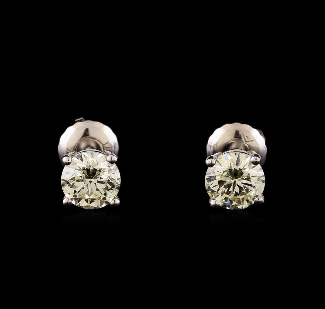One pair electronically tested 14KT white gold cast & assembled diamond solitaire earrings with screw backs. Bright polish finish. Condition is new, good workmanship. Containing: One prong set round brilliant cut diamond, measuring 5.21 - 5.20 x 3.20mm (depth est.), 3.00% GTCF approximate weight of 0.64ct with a medium blue fluorescence. Graded in the setting. Clarity: I-1. Depth: 61.4%. Table 60.5%. One prong set round brilliant cut diamond, measuring 5.14 - 5.13 x 3.30mm (depth est.), 3.00% GTCF approximate weight of 0.64ct with a faint blue fluorescence. Graded in the setting. Clarity: I-1. Depth: 64.2%. Table 60.3%. Total Weight of Diamonds 1.28ct. Total Weight of Earrings 0.96 grams. AIG Appraised at $4,150.00.